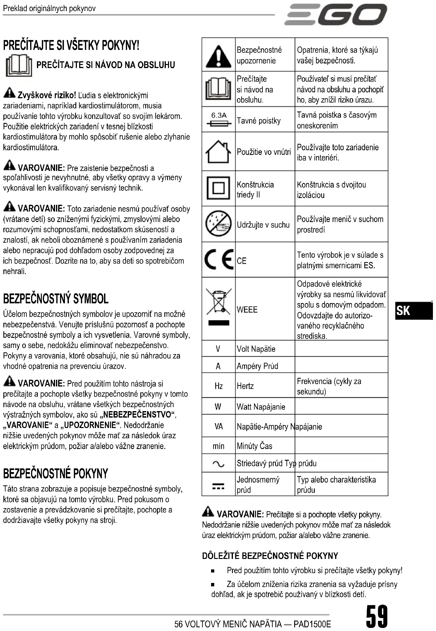 ◾ Pred použitím tohto výrobku si prečítajte všetky pokyny! ◾ Za účelom zníženia rizika zranenia sa vyžaduje prísny dohľad, ak je spotrebič používaný v blízkosti detí.Preklad originálnych pokynov56 VOLTOVÝ MENIČ NAPÄTIA — PAD1500E60