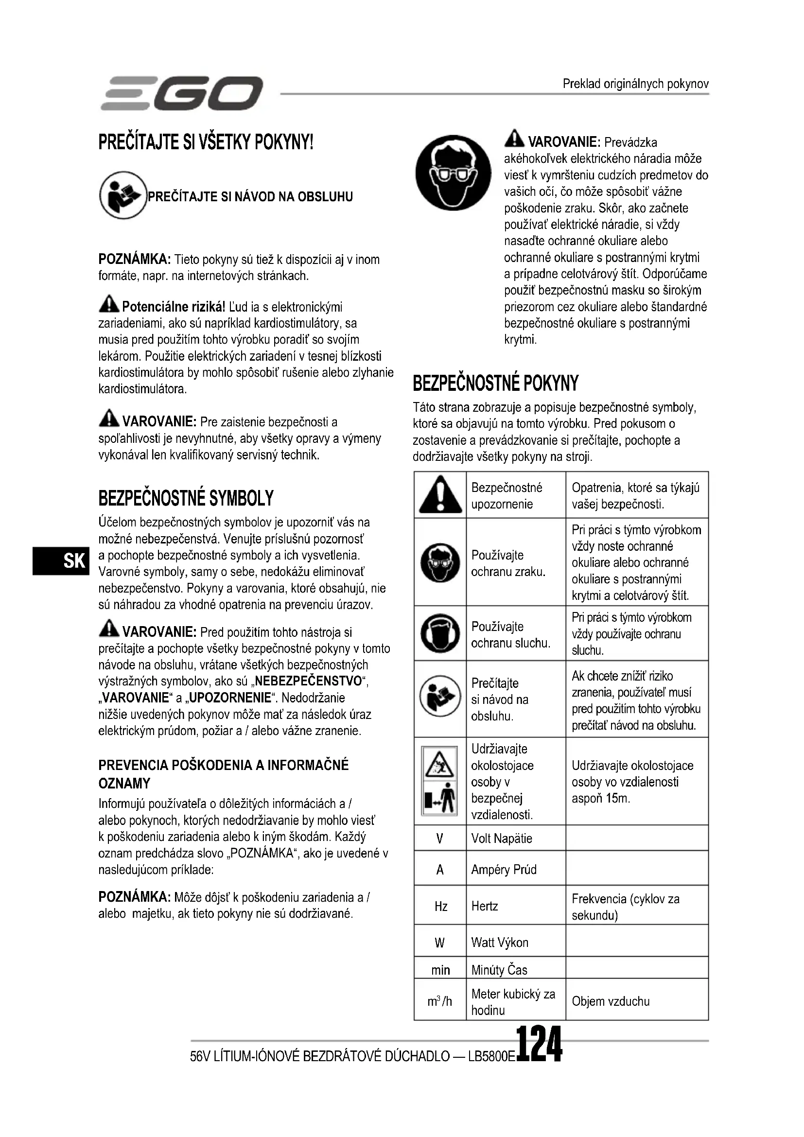 NÁRADIE ◾ Netlačte na elektrické náradie. Používajte správne náradie na vašu prácu. Správne elektrické náradie bude pracovať lepšie a bezpečnejšie pri rýchlosti, na ktorú bolo určené. ◾ Nepoužívajte elektrické náradie v prípade, že vypínač nie je možné zapnúť a vypnúť. Akékoľvek elektrické náradie, ktoré sa nedá ovládať vypínačom je nebezpečné a musí sa opraviť. ◾ Pred akýmkoľvek nastavovaním, výmenou príslušenstva alebo pred uložením elektrického náradia odpojte zástrčku od zdroja a/alebo akumulátora. Tieto preventívne bezpečnostné opatrenia znižujú riziko náhodného spustenia elektrického náradia. ◾ Uchovávajte nepoužívané elektronáradie mimo dosahu detí a nedovoľte, aby osoby neoboznámené s elektrickým náradím alebo s týmito pokynmi náradie používali. Elektrické náradie je nebezpečné v rukách neskúsených používateľov. ◾ Starajte sa o elektrické náradie. Skontrolujte nastavenie pohyblivých častí, poškodenie dielov a akékoľvek ďalšie okolnosti, ktoré môžu mať vplyv na funkciu elektrického náradia. Ak je elektrické náradie poškodené, nechajte ho pred použitím opraviť. Veľa úrazov je zapríčinených zle udržiavaným náradím. ◾ Rezacie nástroje udržiavajte ostré a čisté. Starostlivo ošetrované rezné nástroje s ostrými čepeľami menej pravdepodobne uviaznu a jednoduchšie sa ovládajú. ◾ Používajte elektrické náradie, príslušenstvo, násady a pod. Podľa týchto pokynov s prihliadnutím na pracovné podmienky a prácu, ktorá má byť vykonaná. Použitie elektrického náradia na iné ako určené účely môže viesť k nebezpečným situáciám. ◾ Udržujte rukoväte a uchopovacie plochy suché, čisté, bez oleja a maziva. Klzké držadlá a uchopovacie plochy neumožňujú bezpečnú manipuláciu s nástrojom a jeho ovládanie v nečakaných situáciách. POUŽÍVANIE A STAROSTLIVOSŤ O NÁRADIE NA BATÉRIE ◾ Nabíjajte iba nabíjačkou určenou výrobcom. Nabíjačka vhodná pre jeden typ akumulátora môže spôsobiť riziko požiaru pri použití s iným akumulátorom. ◾ Používajte elektrické náradie iba s výslovne určenými akumulátormi. Použitie iných akumulátorov môže spôsobiť riziko úrazu a požiaru. ◾ Pokiaľ akumulátor nepoužívate, držte ho mimo dosahu kovových predmetov, ako sú kancelárske sponky na papier, mince, kľúče, klince, skrutky alebo ďalšie drobné kovové predmety, ktoré môžu spôsobiť vzájomné skratovanie vývodov. Skratovanie kontaktov akumulátora môže spôsobiť popáleniny alebo požiar. ◾ V nevhodných podmienkach môže kvapalina unikať z batérie. Zabráňte kontaktu. Pri náhodnom kontakte opláchnite vodou. Pri zasiahnutí očí vyhľadajte lekársku pomoc. Unikajúca kvapalina z akumulátora môže spôsobiť podráždenie pokožky alebo popáleniny. ◾ Nepoužívajte akumulátor alebo nástroj, ktorý je poškodený alebo upravený. Poškodené alebo upravené akumulátory môžu mať nepredvídateľné chovanie, ktoré môže viesť k požiaru, výbuchu alebo nebezpečenstvu poranenia. ◾ Nevystavujte akumulátor ani nástroj ohňu alebo nadmernej teplote. Pri vystavení ohňu alebo teplote nad 130 ° C môže dôjsť k výbuchu. ◾ Dodržujte všetky pokyny pre nabíjanie a nenabíjajte akumulátor alebo nástroj mimo rozsah teplôt uvedených v pokynoch. Nesprávne nabíjanie alebo nabíjanie pri teplotách mimo stanovený rozsah môže poškodiť akumulátor a zvýšiť riziko požiaru. OPRAVA ◾ Náradie zverte do opravy kvalikovanej osobe, ktorá použije iba originálne náhradné diely. Zabezpečíte tak zachovanie bezpečnosti elektrického náradia. ◾ Nikdy neopravujte poškodené akumulátory. Servis akumulátorov smie robiť iba výrobca alebo autorizovaní poskytovatelia služieb. PRED POUŽITÍM TOHTO VÝROBKU SI PREČÍTAJTE VŠETKY POKYNY! ŠKOLENIE ◾ Nikdy nedovoľte používať stroj deťom, osobám so zníženými fyzickými, zmyslovými alebo duševnými schopnosťami, alebo nedostatkom skúseností a znalostí alebo ľuďom, ktorí nie sú oboznámení s týmito pokynmi.56V LÍTIUM-IÓNOVÉ BEZDRÁTOVÉ DÚCHADLO — LB5800E