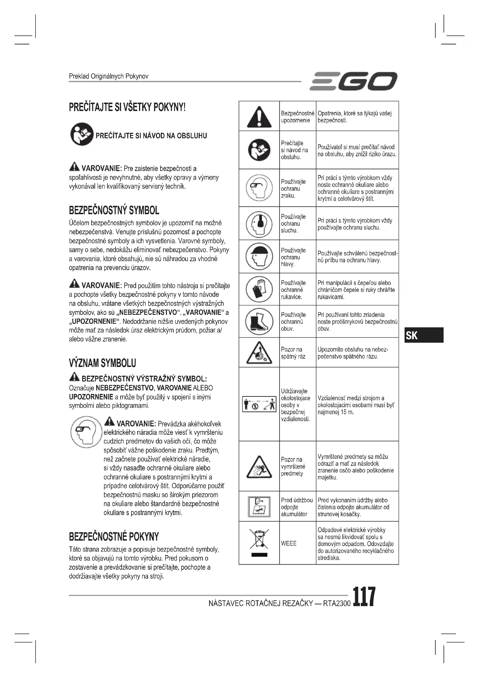 Táto strana zobrazuje a popisuje bezpečnostné symboly, ktoré sa objavujú na tomto výrobku. Pred pokusom o zostavenie a prevádzkovanie si prečítajte, pochopte a dodržiavajte všetky pokyny na stroji. Bezpečnostné upozornenieOpatrenia, ktoré sa týkajú vašej bezpečnosti.Prečítajte si návod na obsluhu.Používateľ si musí prečítať návod na obsluhu, aby znížil riziko úrazu.Používajte ochranu zraku.Pri práci s týmto výrobkom vždy noste ochranné okuliare alebo ochranné okuliare s postrannými krytmi a celotvárový štít.Používajte ochranu sluchu.Pri práci s týmto výrobkom vždy používajte ochranu sluchu.Používajte ochranu hlavy.Používajte schválenú bezpečnost-nú prilbu na ochranu hlavy.Používajte ochranné rukavice.Pri manipulácii s čepeľou alebo chráničom čepele si ruky chráňte rukavicami.Používajte ochrannú obuv.Pri používaní tohto zriadenia noste protišmykovú bezpečnostnú obuv.Pozor na spätný rázUpozornite obsluhu na nebez-pečenstvo spätného rázu.Udržiavajte okolostojace osoby v bezpečnej vzdialenosti.Vzdialenosť medzi strojom a okolostojacimi osobami musí byť najmenej 15 m.Pozor na vymrštené predmetyVymrštené predmety sa môžu odraziť a mať za následok zranenie osôb alebo poškodenie majetku.Pred údržbou odpojte akumulátorPred vykonaním údržby alebo čistenia odpojte akumulátor od strunovej kosačky. WEEE Odpadové elektrické výrobky sa nesmú likvidovať spolu s domovým odpadom. Odovzdajte do autorizovaného recyklačného strediska. Preklad Originálnych PokynovNÁSTAVEC ROTAČNEJ REZAČKY — RTA2300118