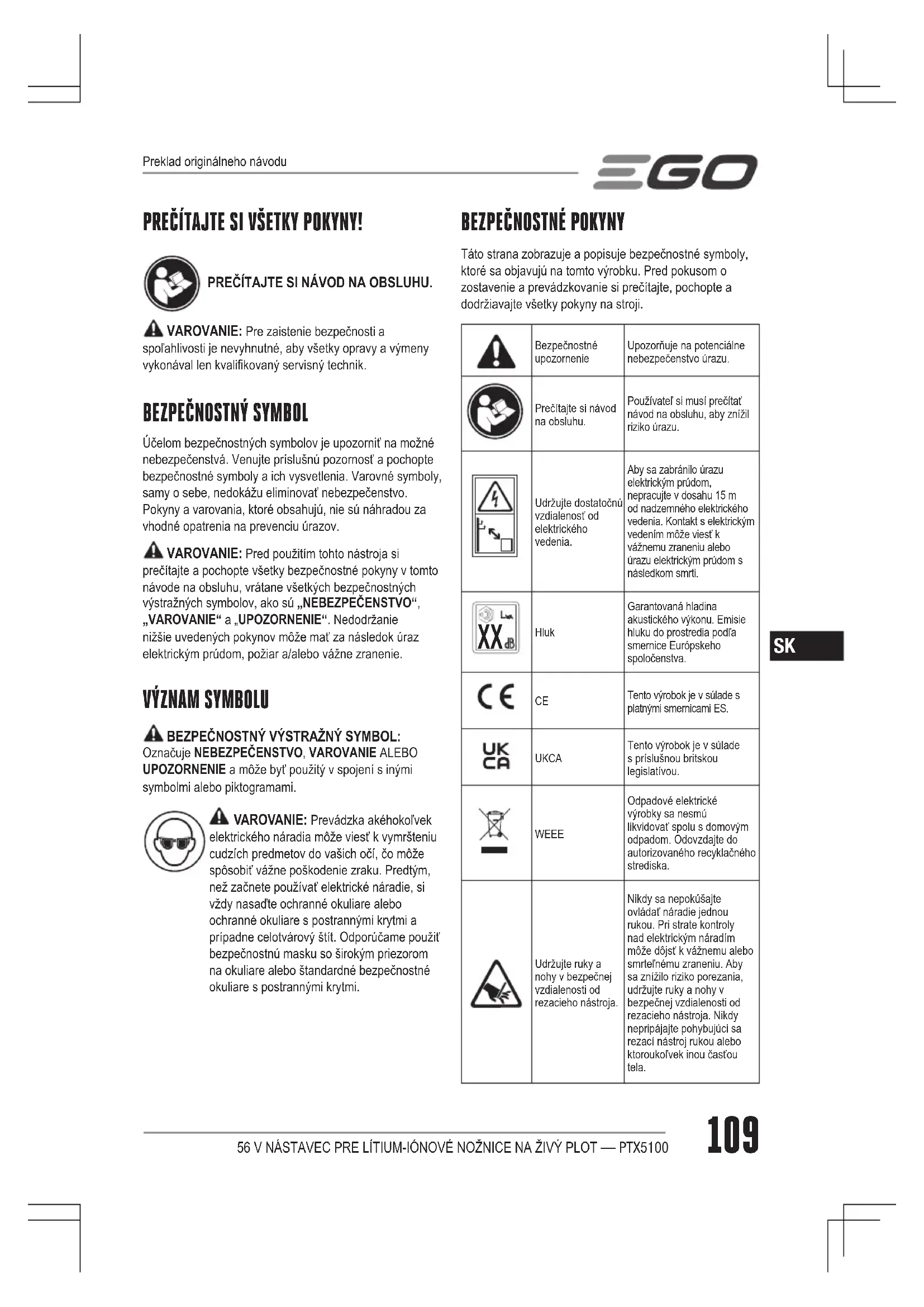 56 V NÁSTAVEC PRE LÍTIUM-IÓNOVÉ NOŽNICE NA ŽIVÝ PLOT — PTX5100 Používajte ochranu očí a hlavy.Pri práci s týmto výrobkom vždy používajte ochranu očí a hlavy. IPX5 Symbol IP Ochrana pred prúdom vody Volt Napätie Milimeter Dĺžka alebo veľkosť Centimeter Dĺžka alebo veľkosť Kilogram HmotnosťJednosmerný prúdTyp alebo charakteristika prúdu BEZPEČNOSTNÉ POKYNY PRE NOŽNICE NA ŽIVÝ PLOT ◾ Nepoužívajte nožnice na živý plot za nepriaznivých poveternostných podmienok, najmä ak existuje nebezpečenstvo blesku. Tým sa znižuje riziko úderu bleskom. ◾ Všetky napájacie káble a vodiče uchovávajte mimo oblasti strihania. Napájacie káble alebo vodiče môžu byť ukryté v kríkoch, či živých plotoch a môže dôjsť k ich náhodnému prerezaniu čepeľou. ◾ Používajte ochranu sluchu. Vhodné ochranné prostriedky znižujú riziko straty sluchu. ◾ Elektrické náradie držte len za izolované rukoväte, pretože strižná lišta môže prísť do kontaktu so skrytým vedením. Pri kontakte čepele so „živým“ vodičom sa môžu obnažené kovové časti nožníc na živý plot stať „živými“ a môžu spôsobiť obsluhe elektrický šok. ◾ Udržujte všetky časti tela mimo dosahu čepele. Neodstraňujte rezaný materiál, alebo ho nepridržiavajte, keď sú čepele v pohybe. Čepele pokračujú v pohybe po vypnutí spínača. Chvíľková nepozornosť pri práci s nožnicami na živý plot môže mať za následok vážne zranenie. ◾ Pri odstraňovaní zaseknutého materiálu alebo pri opravách nožníc na živý plot skontrolujte, či sú vypnuté všetky hlavné vypínače a či je napájacia šnúra odpojená. Neočakávané zapnutie nožníc na živý plot počas čistenia zaseknutého materiálu alebo údržby môže mať za následok vážne zranenie. ◾ Prenášajte nožnice na živý plot za rukoväť so zastavenou čepeľou a dávajte pozor, aby ste nezapli hlavný vypínač. Správne prenášanie nožníc na živý plot znižuje riziko neúmyselného štartu a následného poranenia čepeľou. ◾ Pri preprave alebo skladovaní nožníc na živý plot vždy použite kryty strižnej čepele. Správna manipulácia s nožnicami na živý plot znižuje možnosť úrazu lištami.