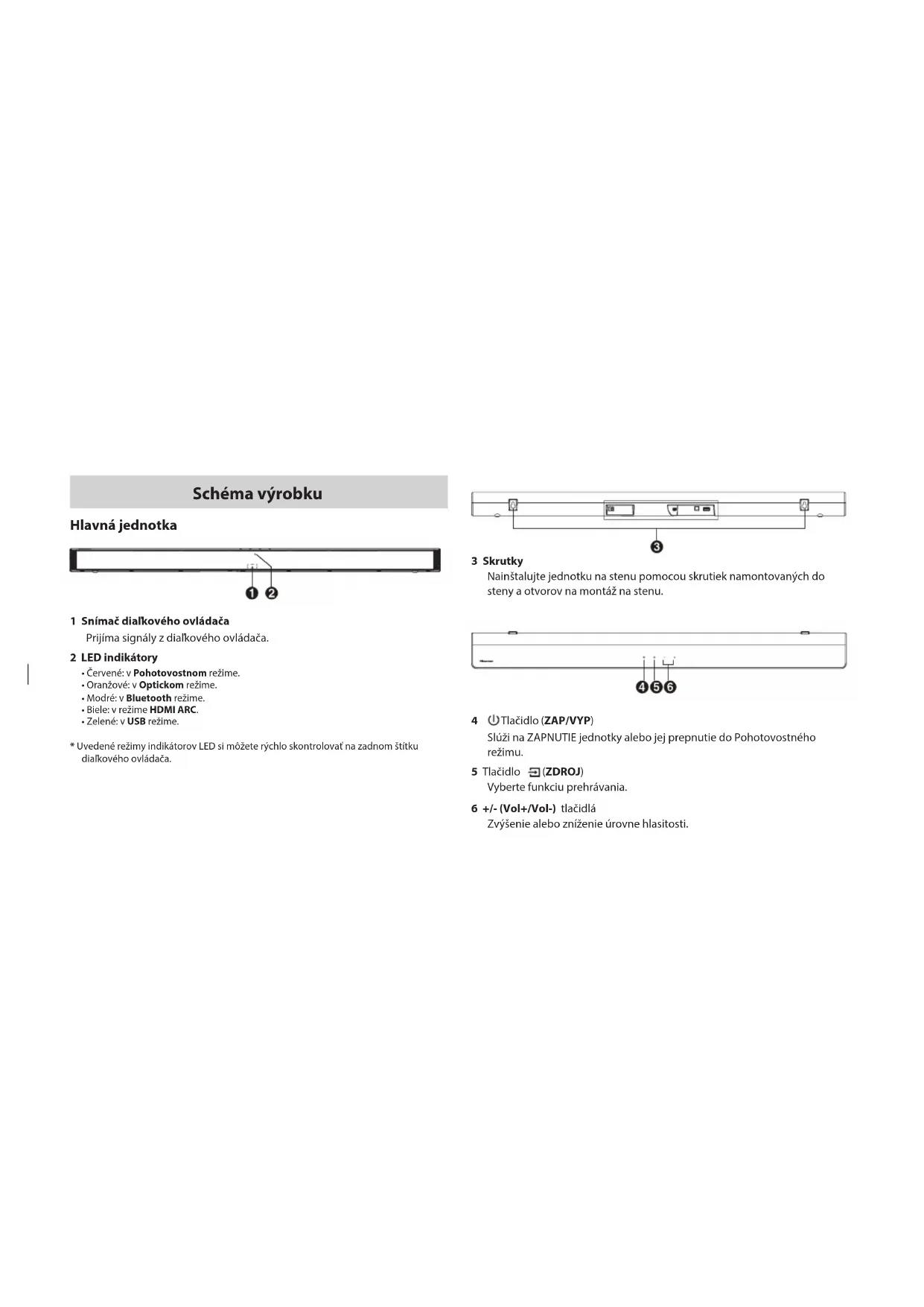 - Uvedené režimy indikátorov LED si môžete rýchlo skontrolovať na zadnom štítku diaľkového ovládača. 3 Skrutky Nainštalujte jednotku na stenu pomocou skrutiek namontovaných do steny a otvorov na montáž na stenu.