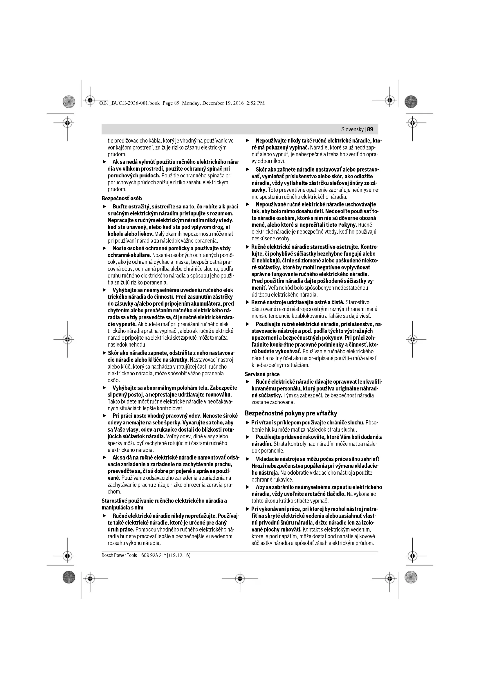 Rychlé vypnutí (Kickback Control) poskytuje lepší kon- trolu nad elektronářadím, a zvyšuje tak ochranu uživa- tele oproti elektronářadí bez funkce Kickback Control. Při náhlé a neočekávané rotaci elektronářadí okolo osy vrtání se elektronářadí vypne. Pro znovuuvedení do provozu uvolněte spínač a znovu jej stiskněte. Pokud je funkce Kickback Control porouchaná, nelze vrtačku zapnout. Nechte elektronářadí opravit pouze kvalifikovaným odborným personálem a pouze s originálními náhradními díly. Nastavení počtu otáček/příklepů Počet otáček/úderů zapnutého elektronářadí můžete plynule regulovat podle toho, jak dalece stlačíte spínač 6. Lehký tlak na spínač 6 vyvolá nízký počet otáček/příklepů. S přibývajícím tlakem se otáčky/příklepy zvyšují. Předvolba počtu otáček/příklepů Pomocí nastavovacího kolečka předvolby počtu otáček 7 mů- žete volit potřebné otáčky/příklepy i během provozu. Potřebné otáčky/příklepy jsou závislé na materiálu a pracov- ních podmínkách a lze je zjistit praktickými zkouškami. OBJ_BUCH-2936-001.book Page 87 Monday, December 19, 2016 2:52 PM88 | Slovensky 1 609 92A 2LY | (19.12.16) Bosch Power Tools Pracovní pokyny Před každou prací na elektronářadí vytáhněte zástrčku ze zásuvky. Na matici/šroub nasaďte jen vypnuté elektronářadí. Otáčející se nástroje mohou sklouznout. Po delší práci s malými otáčkami by jste měli stroj k ochlazení nechat běžet naprázdno ca. 3 minuty při maximálních otáč- kách. Údržba a servis Údržba a čištění Před každou prací na elektronářadí vytáhněte zástrčku ze zásuvky. Udržujte elektronářadí a větrací otvory čisté, abyste pracovali dobře a bezpečně. Je-li nutné nahrazení přívodního kabelu, pak to nechte kvůli zamezení ohrožení bezpečnosti provést firmou Bosch nebo autorizovaným servisem pro elektronářadí Bosch. Zákaznická a poradenská služba Zákaznická služba zodpoví Vaše dotazy k opravě a údržbě Va- šeho výrobku a též k náhradním dílům. Technické výkresy a in- formace k náhradním dílům naleznete i na: www.bosch-pt.com Tým poradenské služby Bosch Vám rád pomůže při otázkách k našim výrobkům a jejich příslušenství. V případě veškerých otázek a objednávek náhradních dílů bezpodmínečně uveďte 10místné věcné číslo podle typového štítku výrobku. Czech Republic Robert Bosch odbytová s.r.o. Bosch Service Center PT K Vápence 1621/16 692 01 Mikulov Na www.bosch-pt.cz si si můžete objednat opravu Vašeho stroje nebo náhradní díly online. Tel.: 519 305700 Fax: 519 305705 E-Mail: servis.naradi@cz.bosch.com www.bosch.cz Zpracování odpadů Elektronářadí, příslušenství a obaly by měly být dodány k opě- tovnému zhodnocení nepoškozujícímu životní prostředí. Neodhazujte elektronářadí do domovního odpadu! Pouze pro země EU: Podle evropské směrnice 2012/19/EU o starých elektrických a elektronických zaříze- ních a jejím prosazení v národních zákonech musí být neupotřebitelné elektronářadí roze- brané shromážděno a dodáno k opětovnému zhodnocení nepoškozujícímu životní pro- středí. Změny vyhrazeny. Slovensky Bezpečnostné pokyny Všeobecné výstražné upozornenia a bezpečnost- né pokyny Prečítajte si všetky Výstražné upozornenia a bezpečnostné pokyny. Zanedbanie dodr- žiavania Výstražných upozornení a pokynov uvedených v na- sledujúcom texte môže mať za následok zásah elektrickým prúdom, spôsobiť požiar a/alebo ťažké poranenie. Tieto Výstražné upozornenia a bezpečnostné pokyny sta- rostlivo uschovajte na budúce použitie. Pojem „ručné elektrické náradie“ používaný v nasledujúcom texte sa vzťahuje na ručné elektrické náradie napájané zo siete (s prívodnou šnúrou) a na ručné elektrické náradie napá- jané akumulátorovou batériou (bez prívodnej šnúry). Bezpečnosť na pracovisku Pracovisko vždy udržiavajte čisté a dobre osvetlené. Neporiadok a neosvetlené priestory pracoviska môžu mať za následok pracovné úrazy. Týmto náradím nepracujte v prostredí ohrozenom vý- buchom, v ktorom sa nachádzajú horľavé kvapaliny, plyny alebo horľavý prach. Ručné elektrické náradie vy- tvára iskry, ktoré by mohli prach alebo pary zapáliť. Nedovoľte deťom a iným nepovolaným osobám, aby sa počas používania ručného elektrického náradia zdržia- vali v blízkosti pracoviska. Pri odpútaní pozornosti zo strany inej osoby môžete stratiť kontrolu nad náradím. Elektrická bezpečnosť Zástrčka prívodnej šnúry ručného elektrického náradia musí pasovať do použitej zásuvky. Zástrčku v žiadnom prípade nijako nemeňte. S uzemneným elektrickým ná- radím nepoužívajte ani žiadne zástrčkové adaptéry. Nezmenené zástrčky a vhodné zásuvky znižujú riziko zása- hu elektrickým prúdom. Vyhýbajte sa telesnému kontaktu s uzemnenými povr- chovými plochami, ako sú napr. rúry, vykurovacie tele- sá, sporáky a chladničky. Keby by bolo Vaše telo uzemne- né, hrozí zvýšené riziko zásahu elektrickým prúdom. Chráňte elektrické náradie pred účinkami dažďa a vlh- kosti. Vniknutie vody do ručného elektrického náradia zvy- šuje riziko zásahu elektrickým prúdom. Nepoužívajte prívodnú šnúru mimo určený účel na no- senie ručného elektrického náradia, ani na jeho zave- senie a zástrčku nevyberajte zo zásuvky ťahaním za prívodnú šnúru. Zabezpečte, aby sa sieťová šnúra ne- dostala do blízkosti horúceho telesa, ani do kontaktu s olejom, s ostrými hranami alebo pohybujúcimi sa sú- čiastkami ručného elektrického náradia. Poškodené alebo zauzlené prívodné šnúry zvyšujú riziko zásahu elek- trickým prúdom. Keď pracujete s ručným elektrickým náradím vonku, použ