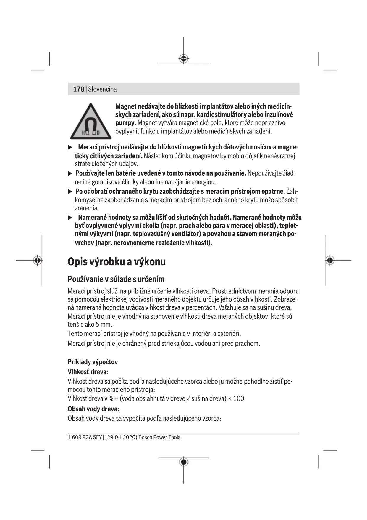 - %) – červená: kritická vlhkosť dreva (>20%) Uloženie nameranej hodnoty Ak chcete uložiť nameranú hodnotu do pamäte, krátko stlačte tlačidlo zapnutia/vypnutia/ podržania (1). Uložená nameraná hodnota sa zobrazí vdolnom riadku (b) displeja (3). Nová nameraná hodnota sa zobrazí vriadku (a) displeja (3). Po uložení novej nameranej hodnoty vdolnom riadku (b) sa predchádzajúca nameraná hodnota zobrazí vhornom riadku (b) atď. Na displeji (3) môžu byť zobrazené dve namerané hodnoty (b). Uložené namerané hodnoty (b) sú zobrazené so zvolenou skupinou dreva asymbolom vlhkosti vo forme vodných kvapiek: – 1 vodná kvapka (zodpovedá zelenej LED dióde): nekritická vlhkosť dreva (<12%) – 2 vodné kvapky (zodpovedá žltej LED dióde): povážlivá vlhkosť dreva (12% %) – 3 vodné kvapky (zodpovedá červenej LED dióde): kritická vlhkosť dreva (>20%) Rada: Tieto indikácie sú užitočné, keď displej (3) nie je zistého uhla viditeľný alebo keď je potrebné urobiť porovnávacie merania. Pri vypnutí meracieho prístroja sa uložené namerané hodnoty vymažú. Príklady použitia aorientačné hodnoty vlhkosti dreva vdrevárstve Meranie vlhkosti: – palivového dreva pred spaľovaním: bráni tvorbe dymu aznižuje množstvo spalín – parkiet pred ukladaním: bráni tvorbe škár po uložení – nábytkárskeho dreva: bráni deformovaniu, napadnutiu pliesňami, hmyzom aprask- linám – drevených domov/záhradných domčekov: bráni tvorbe plesne aodhaľuje škody spô- sobené vodou – drevených karavanov: možnosť ochrániť sa pred kúpou/prenájmom karavanu sples- ňou alebo schátralého karavanu Nasledujúca tabuľka ukazuje typické vlhkosti dreva pre jednotlivé použitia. Druh použitia Vlhkosť dreva [%] Príklady Zo všetkých strán uzatvorené stav- by skúrením 9 ± 3 napr. stoly, stoličky, skrine vobý- vačke/kuchyni (pri vykurovaní vzi- me) 1 609 92A 5EY | (29.04.2020) Bosch Power ToolsSlovenčina | 185 Druh použitia Vlhkosť dreva [%] Príklady Zo všetkých strán uzatvorené stav- by bez kúrenia 12 ± 3 napr. pivničné regály (bez vykuro- vania) Zastrešené, otvorené stavby 15 ± 3 napr. prístrešky pre autá Konštrukcie, ktoré sú zo všetkých strán vystavené poveternostným vplyvom 18 ± 6 napr. vonkajšie steny záhradných domčekov Ďalšie vlhkosti dreva: – Drevený dom: max. 18% – Parkety: 9% ± 2% – Podlaha: max. 12% – Slepá podlaha: max. 20% – Podkladová podlaha: max. 15% – Schody: 9% ± 3% – Drevo na kúrenie: max. 22% (optimálne <17%) Funkcia autotestu Funkcia autotestu kontroluje funkčnosť meracieho prístroja. Zapnite merací prístroj (pozri „Zapnutie/vypnutie“, Stránka182). Odoberte ochranný kryt (6). Držte kolíky (5) za kovové kontakty (12) na zadnej strane ochranného krytu (6) (pozri obrázok C). Porovnajte hodnotu na displeji svytlačenými hodnotami na ochrannom kryte (6) podľa vašej nastavenej skupiny dreva: – Skupina dreva A: 11,1% – 11,9% – Skupina dreva B: 9,8% – 10,4% Ak hodnoty nesúhlasia pošlite merací prístroj prostredníctvom predajcu zákazníckemu servisu Bosch. Pracovné pokyny Vplyvy na výsledok merania Presnosť nameraných hodnôt je najväčšia, ak sa teplota okolitého prostredia zhoduje steplotou meraného kusa dreva. Výsledok merania môže ovplyvniť: Bosch Power Tools 1 609 92A 5EY | (29.04.2020)186 | Slovenčina – Skupina dreva apodskupina dreva – Teplota meraného kusa dreva – Rozdelenie meraného kusa dreva na jadrové drevo abeľové drevo – Hĺbka zasunutia kolíkov vmeranom kuse dreva – Povrchová úprava meraného kusa dreva (napr. oleje alebo laky) – Meranie rovnobežne alebo kolmo na štruktúru alebo textúru meraného kusa dreva – Rozloženie vlhkosti – Merací bod (napr. vstrede alebo na konci kusa dreva) – Stav apovaha kusa dreva: drevo by malo byť bez hniloby, hrčí ainých nedostatkov Pozor: Ak potrebujete presné hodnoty, je nutné urobiť meranie podľa metódy sušenia aváženia (presný laboratórny postup podľa DIN 52183). Chyby – príčiny aodstránenie Príčina Pomoc Výstražný symbol (c), indikácia teploty (d) a„Err“ na displeji Teplota okolitého prostredia je mimo roz- sahu prevádzkovej teploty –5°C až +50°C. Počkajte, kým merací prístroj nedosiahne prevádzkovú teplotu. Pri skupine dreva A: > 74,7 % a„HI“ na displeji Pri skupine dreva B: > 61,9 % a„HI“ na displeji Vlhkosť dreva mimo rozsahu merania (príliš vysoká) Opakované meranie na inom mieste na dreve. Indikácia „– –.–“ na displeji Vlhkosť dreva mimo rozsahu merania (príliš nízka) alebo meranie nebolo vykonané správne Opakované meranie na inom mieste na dreve. Merací prístroj kontroluje správnu funkčnosť pri každom meraní. Ak sa zistí chyba, na displeji sa zobrazí „Err“ avýstražný symbol (c). Merací prístroj vypnite aopäť zapnite. Ak chyba pretrváva, vyberte batérie apo niekoľkých sekundách ich znova založte. Ak uve- dené opatrenia nedokážu poruchu odstrániť, pošlite merací prístroj prostredníctvom svojho predajcu zákazníckemu servisu Bosch. 1 609 92A 5EY | (29.04.2020) Bosch Power ToolsSlovenčina | 187 Údržba aservis Údržba ačistenie Pred každým použitím merací prístroj skontrolujte. Pri viditeľných poškodeniach alebo uvoľnených častiach vnútri meracieho prístroja už nie je zaručená bezpečná funkčnosť. Merací prístroj odkladajte aprepravujte vždy len vo vhodnom boxe, ako je originálne balenie. Vprípade potreby opravy zašlite merací prístroj voriginálnom balení. Cez kolíky nelepte žiadnu nálepku. Udržiavajte svoj merací prístroj vždy včistote. Neponárajte merací prístroj do vody ani do iných kvapalín. Znečistenia utrite vlhkou mäkkou handričkou. Nepoužívajte žiadne čistiace prostriedky či rozpúšťadlá. Pri čistení sa nesmie dostať do meracieho prístroja žiadna kvap
