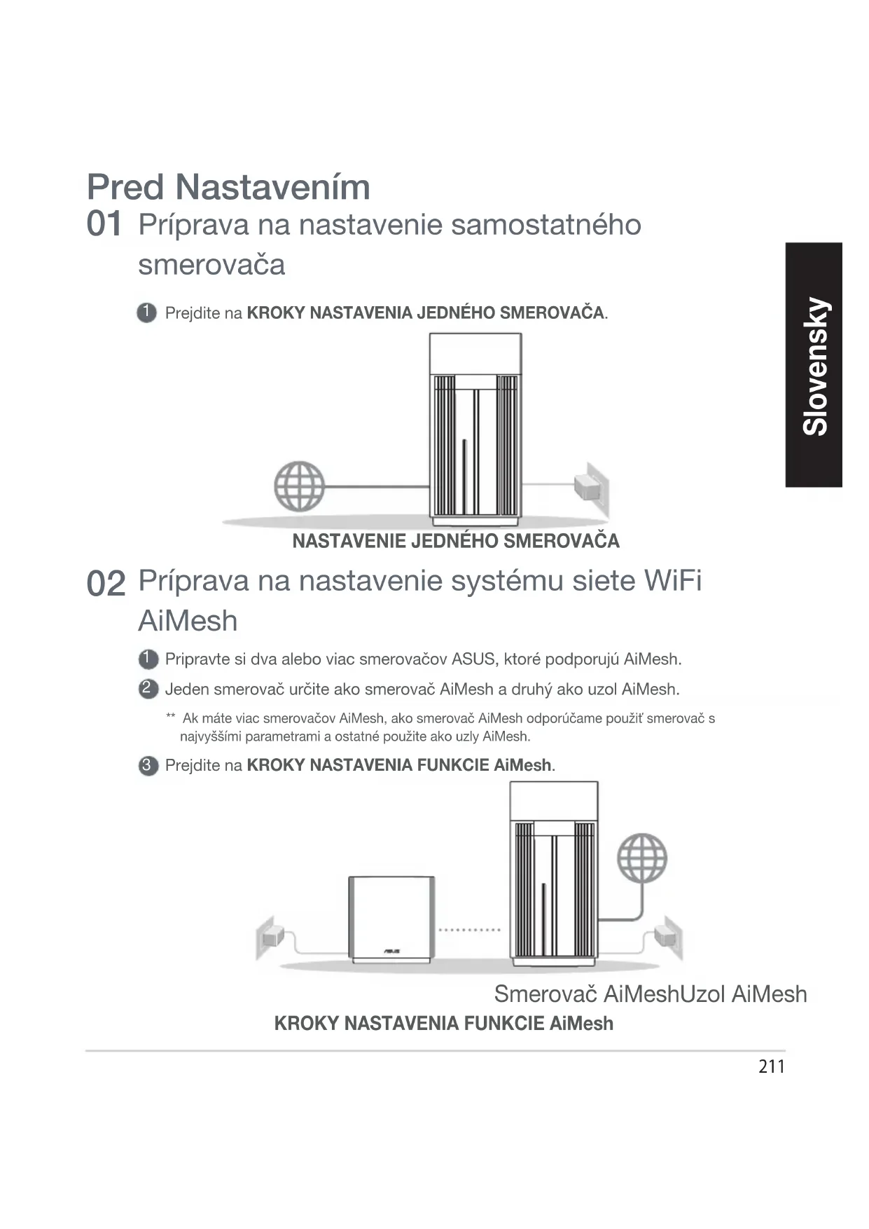 [Web (Sieť)] Otvorte webový prehľadávač. Budete presmerovaní na sprievodcu nastavením ASUS. Ak k tomu nedôjde, prejdite na stránku http://router.asus.com. [App (Aplikácia)] Spustite aplikáciu ASUS Router a na dokončenie nastavenia postupujte podľa pokynov. Kroky Nastavenia Funkcie AiMesh Príprava