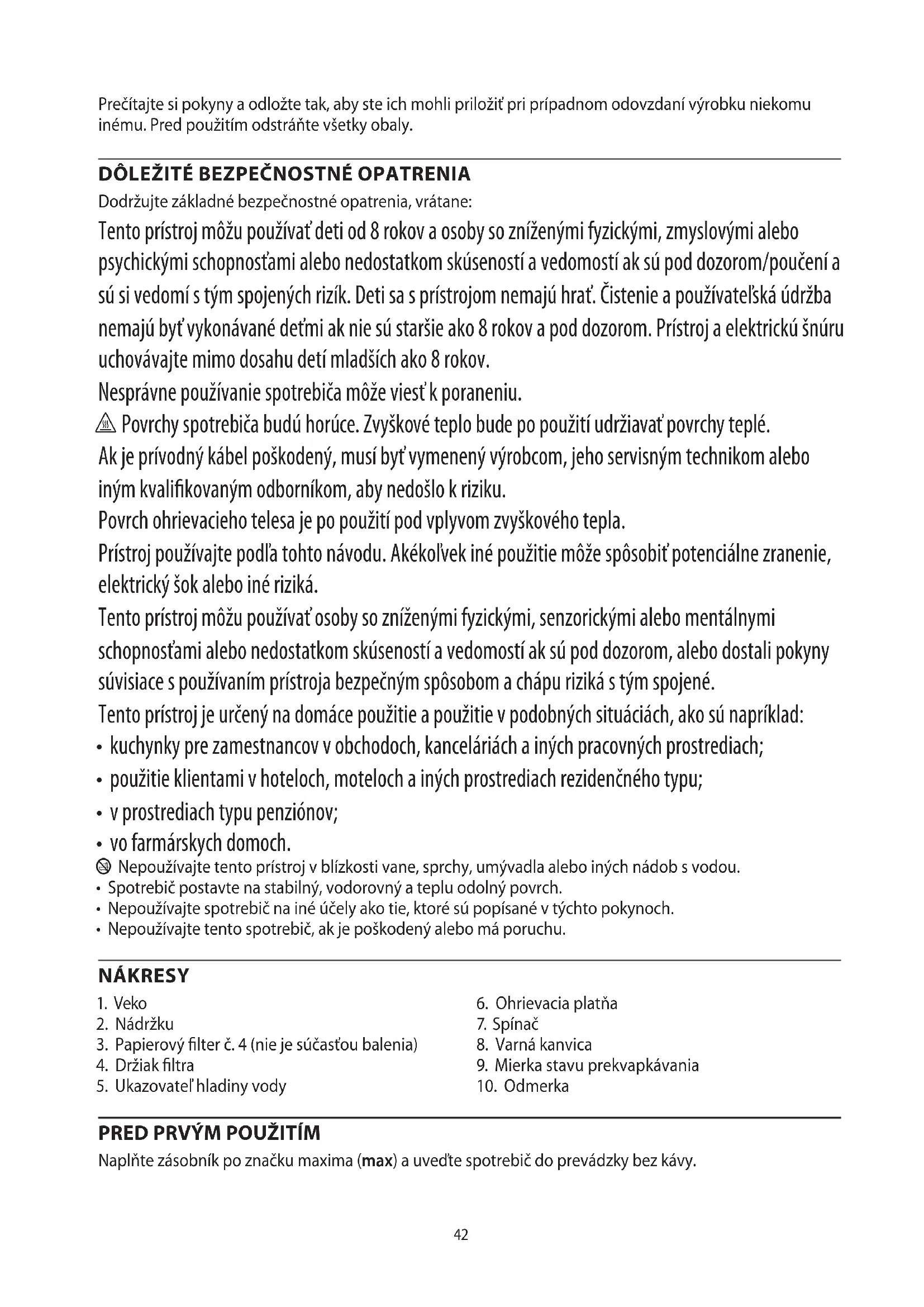 Dodržujte základné bezpečnostné opatrenia, vrátane: Tento prístroj môžu používať deti od 8 rokov a osoby so zníženými fyzickými, zmyslovými alebo psychickými schopnosťami alebo nedostatkom skúseností a vedomostí ak sú pod dozorom/poučení a sú si vedomí s tým spojených rizík. Deti sa s prístrojom nemajú hrať. Čistenie a používateľská údržba nemajú byť vykonávané deťmi ak nie sú staršie ako 8 rokov a pod dozorom. Prístroj a elektrickú šnúru uchovávajte mimo dosahu detí mladších ako 8 rokov. Nesprávne používanie spotrebiča môže viesť k poraneniu. h Povrchy spotrebiča budú horúce. Zvyškové teplo bude po použití udržiavať povrchy teplé. Ak je prívodný kábel poškodený, musí byť vymenený výrobcom, jeho servisným technikom alebo iným kvalifikovaným odborníkom, aby nedošlo k riziku. Povrch ohrievacieho telesa je po použití pod vplyvom zvyškového tepla. Prístroj používajte podľa tohto návodu. Akékoľvek iné použitie môže spôsobiť potenciálne zranenie, elektrický šok alebo iné riziká. Tento prístroj môžu používať osoby so zníženými fyzickými, senzorickými alebo mentálnymi schopnosťami alebo nedostatkom skúseností a vedomostí ak sú pod dozorom, alebo dostali pokyny súvisiace s používaním prístroja bezpečným spôsobom a chápu riziká s tým spojené. Tento prístroj je určený na domáce použitie a použitie v podobných situáciách, ako sú napríklad: