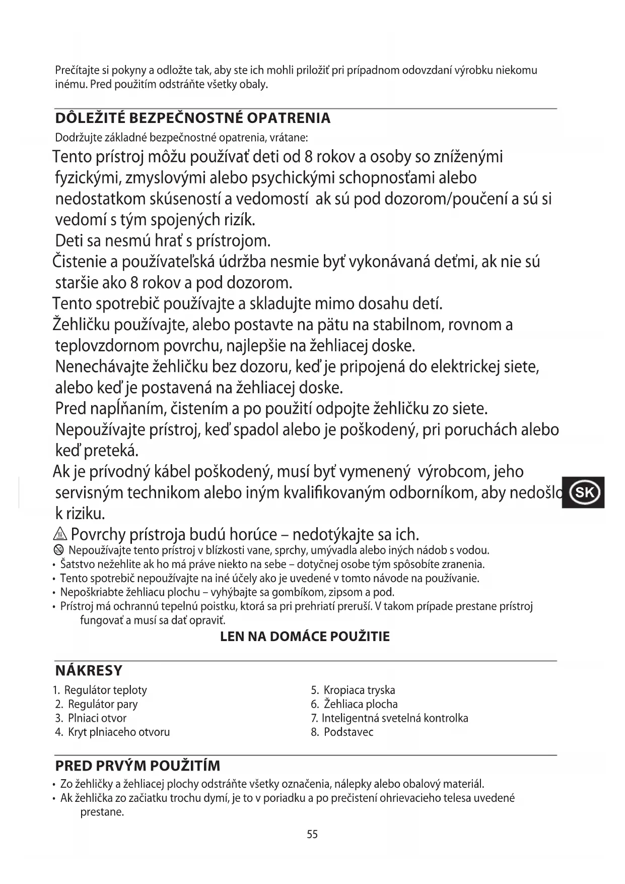 Nenechávajte zhehlicku bez dozoru, ked' je pripojená do elektrickej siete, alebo ked' je postavená na zhehliacej doske.