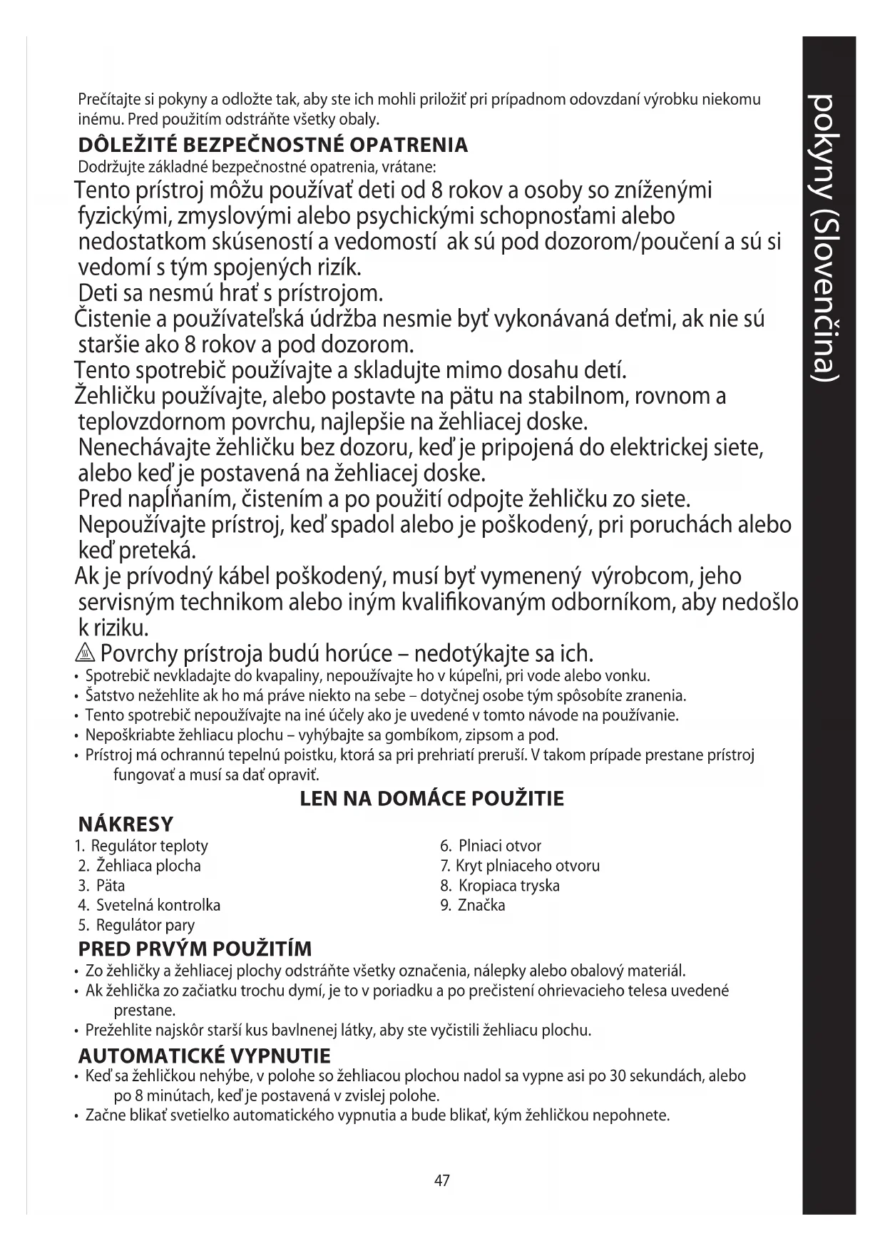 Dodržujte základné bezpečnostné opatrenia, vrátane: Tento prístroj môžu používať deti od 8 rokov a osoby so zníženými fyzickými, zmyslovými alebo psychickými schopnosťami alebo nedostatkom skúseností a vedomostí ak sú pod dozorom/poučení a sú si vedomí s tým spojených rizík. Deti sa nesmú hrať s prístrojom. Čistenie a používateľská údržba nesmie byť vykonávaná deťmi, ak nie sú staršie ako 8 rokov a pod dozorom. Tento spotrebič používajte a skladujte mimo dosahu detí. Žehličku používajte, alebo postavte na pätu na stabilnom, rovnom a teplovzdornom povrchu, najlepšie na žehliacej doske. Nenechávajte žehličku bez dozoru, keď je pripojená do elektrickej siete, alebo keď je postavená na žehliacej doske. Pred napĺňaním, čistením a po použití odpojte žehličku zo siete. Nepoužívajte prístroj, keď spadol alebo je poškodený, pri poruchách alebo keď preteká. Ak je prívodný kábel poškodený, musí byť vymenený výrobcom, jeho servisným technikom alebo iným kvalifikovaným odborníkom, aby nedošlo k riziku. h Povrchy prístroja budú horúce – nedotýkajte sa ich.