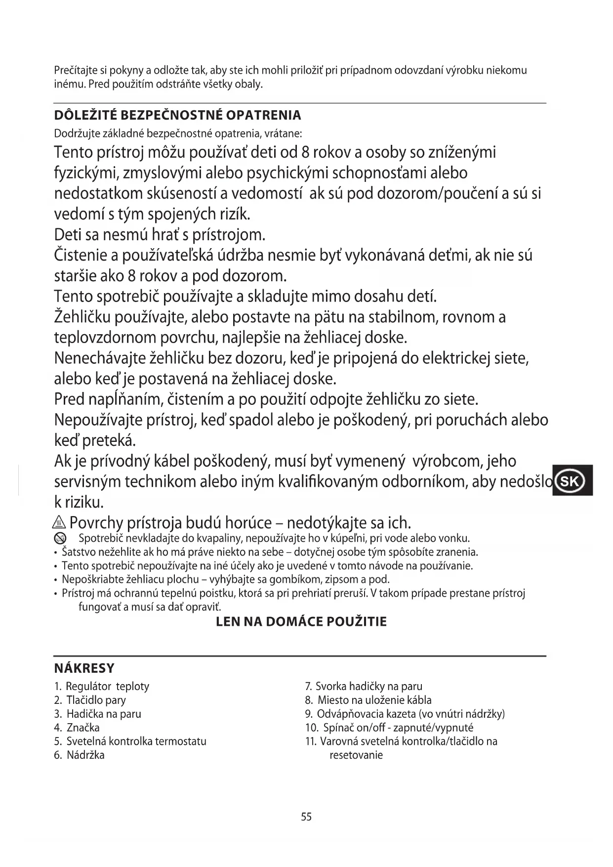 Dodržujte základné bezpečnostné opatrenia, vrátane: Tento prístroj môžu používať deti od 8 rokov a osoby so zníženými fyzickými, zmyslovými alebo psychickými schopnosťami alebo nedostatkom skúseností a vedomostí ak sú pod dozorom/poučení a sú si vedomí s tým spojených rizík. Deti sa nesmú hrať s prístrojom. Čistenie a používateľská údržba nesmie byť vykonávaná deťmi, ak nie sú staršie ako 8 rokov a pod dozorom. Tento spotrebič používajte a skladujte mimo dosahu detí. Žehličku používajte, alebo postavte na pätu na stabilnom, rovnom a teplovzdornom povrchu, najlepšie na žehliacej doske. Nenechávajte žehličku bez dozoru, keď je pripojená do elektrickej siete, alebo keď je postavená na žehliacej doske. Pred napĺňaním, čistením a po použití odpojte žehličku zo siete. Nepoužívajte prístroj, keď spadol alebo je poškodený, pri poruchách alebo keď preteká. Ak je prívodný kábel poškodený, musí byť vymenený výrobcom, jeho servisným technikom alebo iným kvalikovaným odborníkom, aby nedošlo k riziku. h Povrchy prístroja budú horúce – nedotýkajte sa ich.