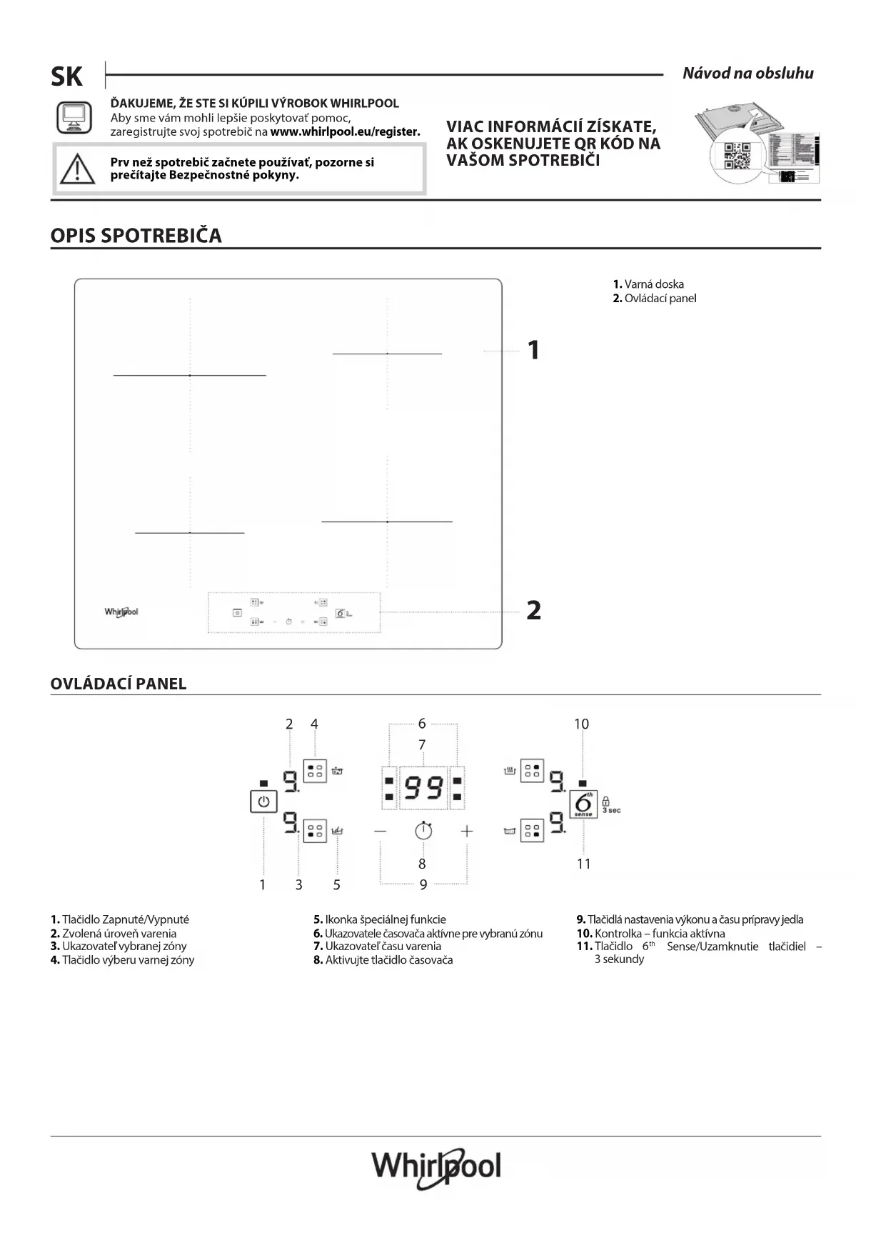 1. Tlačidlo Zapnuté/Vypnuté2. Zvolená úroveň varenia3. Ukazovateľ vybranej zóny4. Tlačidlo výberu varnej zóny5. Ikonka špeciálnej funkcie6. Ukazovatele časovača aktívne pre vybranú zónu7. Ukazovateľ času varenia8. Aktivujte tlačidlo časovača9. Tlačidlá nastavenia výkonu ačasu prípravy jedla10. Kontrolka – funkcia aktívna11. Tlačidlo 6 Sense/Uzamknutie tlačidiel – 3sekundyĎAKUJEME, ŽE STE SI KÚPILI VÝROBOK WHIRLPOOLAby sme vám mohli lepšie poskytovať pomoc, zaregistrujte svoj spotrebič na www.whirlpool.eu/register. VIAC INFORMÁCIÍ ZÍSKATE,