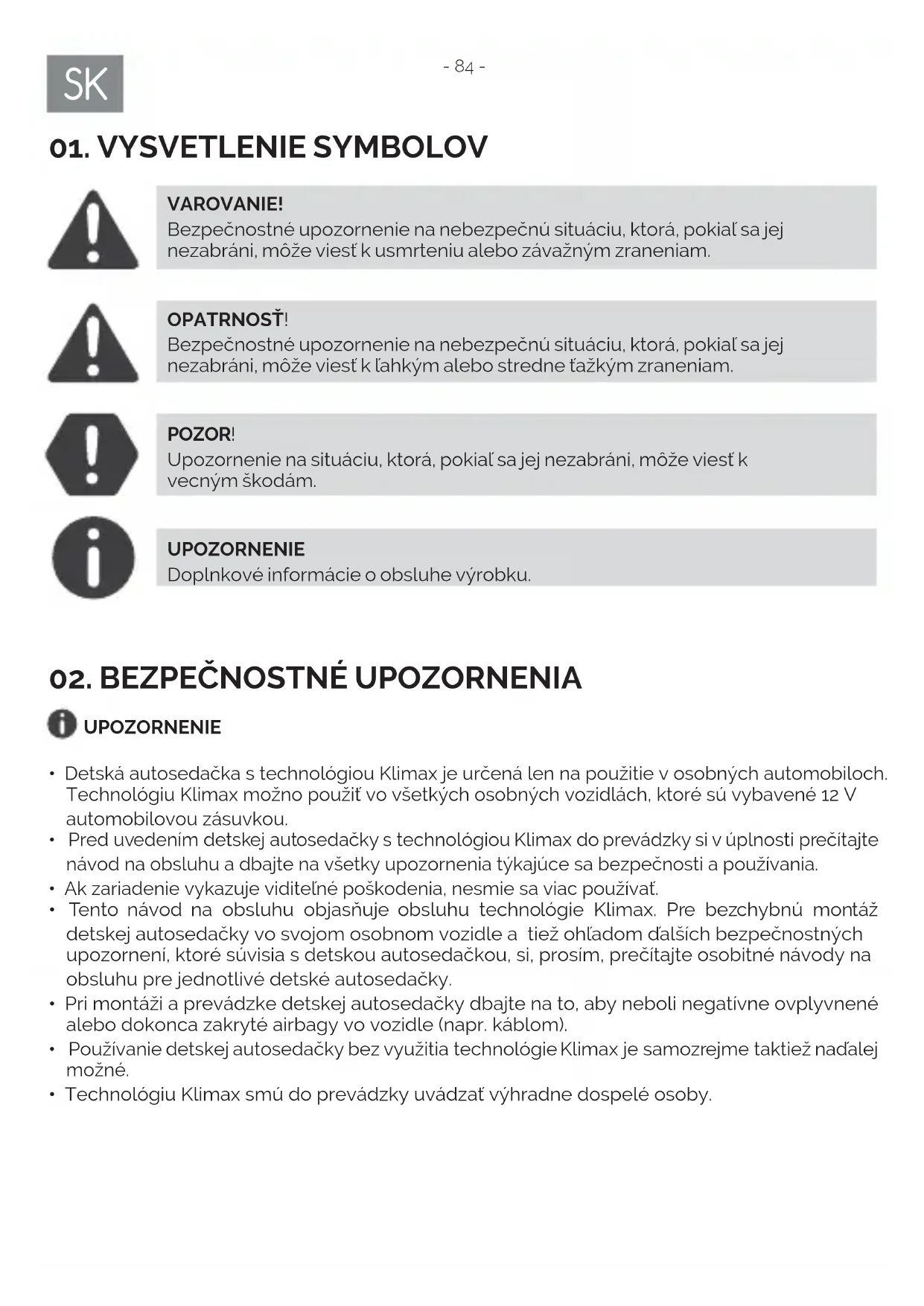 - Pred uvedenim detskj autosedacky s technologiou Klimax do prevadzky si v uplnosti precitajte navod na obsluhu a dbajte na vsetky upozornenia tykajuce sa bezpecnosti a pouzivania.