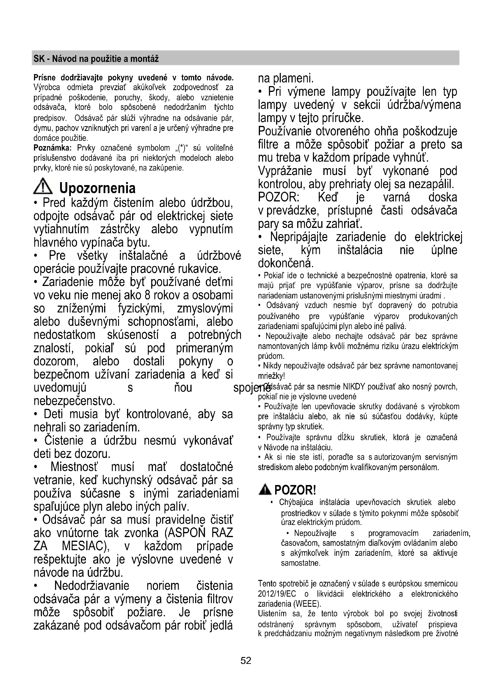 - Pri výmene lampy používajte len typ lampy uvedený v sekcii údržba/výmena lampy v tejto príručke. Používanie otvoreného ohňa poškodzuje filtre a môže spôsobiť požiar a preto sa mu treba v každom prípade vyhnúť. Vyprážanie musí byť vykonané pod kontrolou, aby prehriaty olej sa nezapálil. POZOR: Keď je varná doska v prevádzke, prístupné časti odsávača pary sa môžu zahriať.
