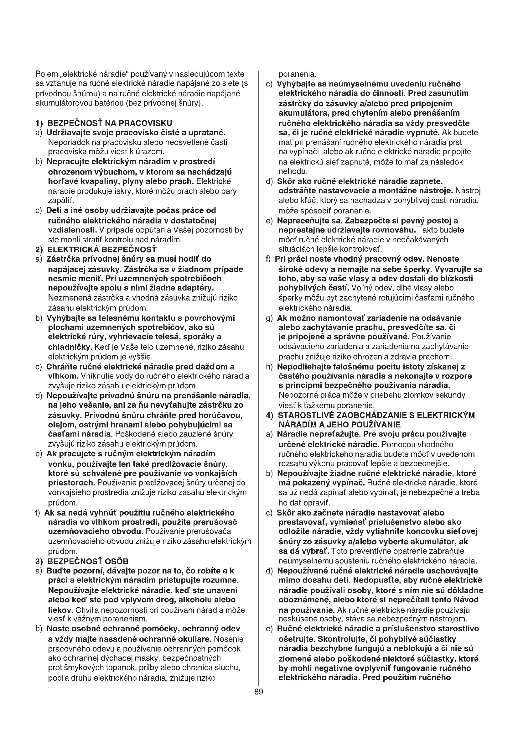 a) Buďte pozorní, dávajte pozor na to, čo robíte a k práci s elektrickým náradím pristupujte rozumne. Nepoužívajte elektrické náradie, keď ste unavení alebo keď ste pod vplyvom drog, alkoholu alebo liekov. Chvíľa nepozornosti pri používaní náradia môže viesť k vážnym poraneniam. b) Noste osobné ochranné pomôcky, ochranný odev a vždy majte nasadené ochranné okuliare. Nosenie pracovného odevu a používanie ochranných pomôcok ako ochrannej dýchacej masky, bezpečnostných protišmykových topánok, prilby alebo chrániča sluchu, podľa druhu elektrického náradia, znižuje riziko90