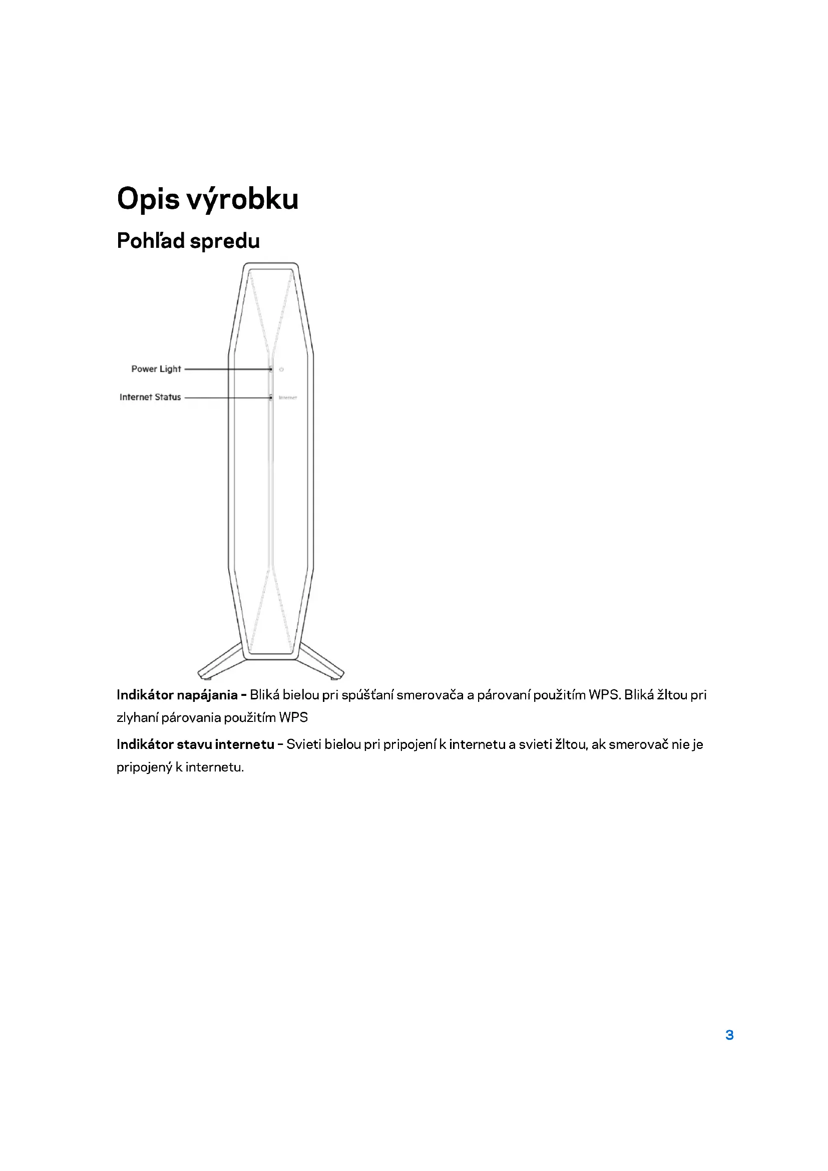 Počkajte, dokým nebude blikajúci zelený indikátor medzi tlačidlom Reset a napájacím konektorom svietiť nepretržite. Počkajte dve minúty a až potom sa skúste pripojiť k internetu z počítača.22 Technické údaje Belkin RT1800 Názov modelu Dvojpásmový gigabitový smerovač WiFi 6 AX1800 Číslo modelu RT1800 Rýchlosť portov prepínača 10/100/1000 Mb/s (rýchly Ethernet) Frekvencia signálu 2,4 GHz a 5 GHz Počet antén 4 interné Rozhrania Ethernet (1 – 4), Internet, napájanie, USB 3.0 Tlačidlá Wi-Fi Protected Setup, Reset, hlavný vypínač Indikátory LED Napájanie, Internet, Ethernet (1–4) UPnP Podporované zabezpečenie WPA2 Personal, WPA3 Personal, WPA2/WPA3 Mixed Personal Bezpečnostný kľúč Šifrovanie max. 128-bit. Fyzické rozmery 156 mm (D) x 77,11 mm (Š) x 220 mm (V) Hmotnosť zariadenia 850 g Napájanie 12 V, 2A Certifikácia FCC, CE, Wi-Fi (IEEE 802.11 a/b/g/n/ac/ax) Prevádzková teplota 32 °F až 104 °F (0 °C až 40 °C) Skladovacia teplota -4 °F až 140 °F (-20 °C až 60 °C) Prevádzková vlhkosť Relatívna vlhkosť 10 % až 80 %, nekondenzujúca Skladovacia vlhkosť 5 % až 90% nekondenzujúca Poznámky: Regulačné informácie, informácie o záruke a bezpečnostné informácie nájdete na disku CD, ktorý je súčasťou balenia smerovača, alebo navštívte lokalitu belkin.com/support/ RT1800. Špecifikácie sa môžu zmeniť bez predchádzajúceho upozornenia. Maximálny výkon je odvodený od špecifikácií normy IEEE 802.11. Skutočný výkon sa môže líšiť, vrátane poklesu kapacity bezdrôtovej siete, dátového toku, rozsahu a pokrytia. Výkon závisí od mnohých faktorov, podmienok a premenných vrátane vzdialenosti od prístupového bodu, objemu sieťovej prevádzky, stavebných materiálov a konštrukcie budovy, použitého operačného systému, kombinácie použitých bezdrôtových produktov, interferencie a iných nepriaznivých podmienok.23 BELKIN, LINKSYS a mnohé iné názvy produktov a logá sú obchodnými známkami skupiny spoločností Belkin. Uvedené obchodné známky tretej strany sú majetkom príslušných vlastníkov. Licencie a upozornenia týkajúce sa softvéru tretích strán si môžete pozrieť na: http://support.belkin.com/en- us/license. S otázkami alebo požiadavkami týkajúcimi sa zdrojového kódu GPL sa obráťte na http://support.belkin.com/en-us/gplcodecenter