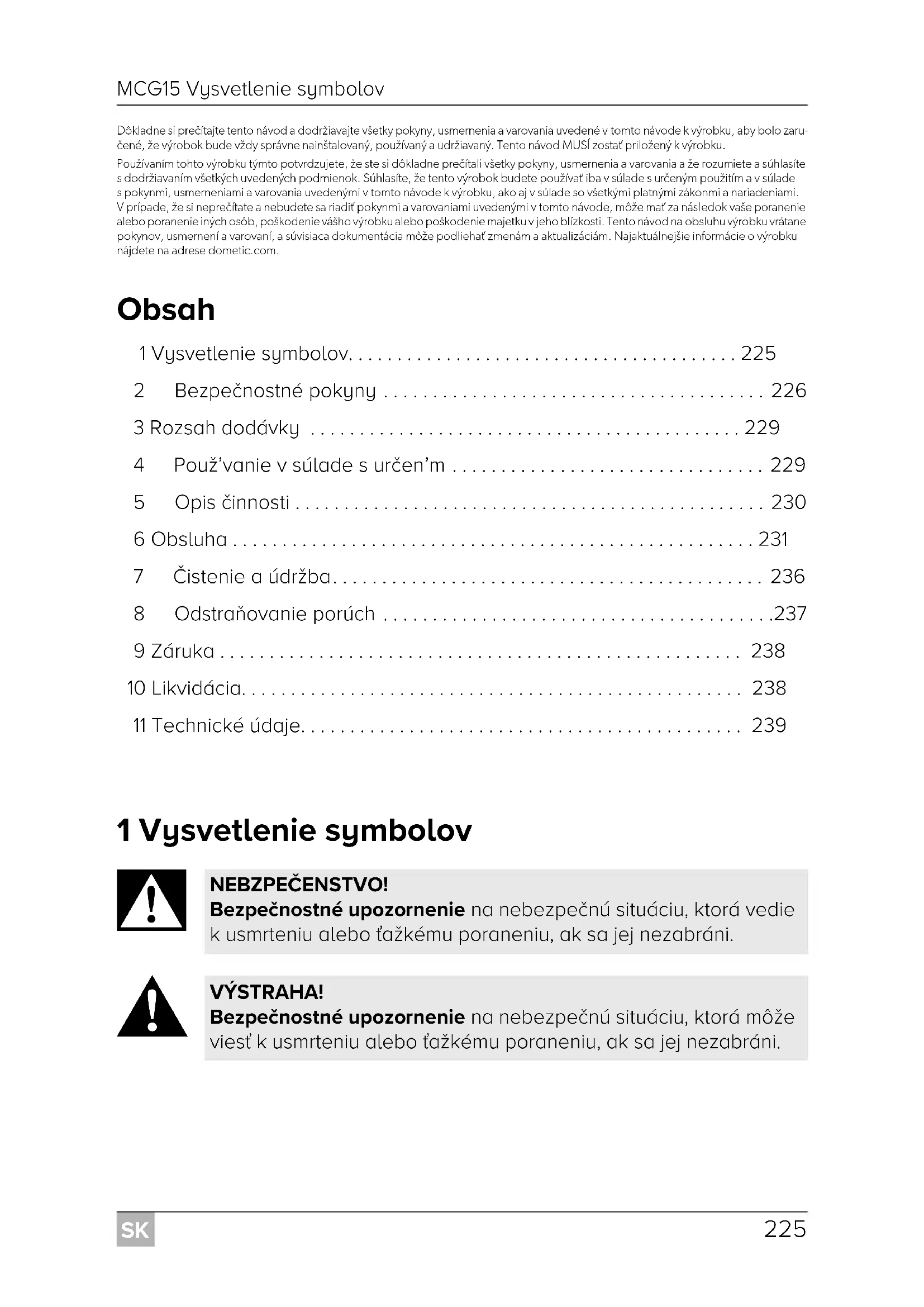 - Dôkladne si prečítajte tento návod a dodržiavajte všetky pokyny, usmernenia a varovania uvedené v tomto návode k výrobku, aby bolo zaru- čené, že výrobok bude vždy správne nainštalovaný, používaný a udržiavaný. Tento návod MUSÍ zostať priložený k výrobku. Používaním tohto výrobku týmto potvrdzujete, že ste si dôkladne prečítali všetky pokyny, usmernenia a varovania a že rozumiete a súhlasíte s dodržiavaním všetkých uvedených podmienok. Súhlasíte, že tento výrobok budete používať iba v súlade s určeným použitím a v súlade s pokynmi, usmerneniami a varovania uvedenými v tomto návode k výrobku, ako aj v súlade so všetkými platnými zákonmi a nariadeniami. V prípade, že si neprečítate a nebudete sa riadiť pokynmi a varovaniami uvedenými v tomto návode, môže mať za následok vaše poranenie alebo poranenie iných osôb, poškodenie vášho výrobku alebo poškodenie majetku v jeho blízkosti. Tento návod na obsluhu výrobku vrátane pokynov, usmernení a varovaní, a súvisiaca dokumentácia môže podliehať zmenám a aktualizáciám. Najaktuálnejšie informácie o výrobku nájdete na adrese dometic.com. Obsah 1 Vysvetlenie symbolov p. 225