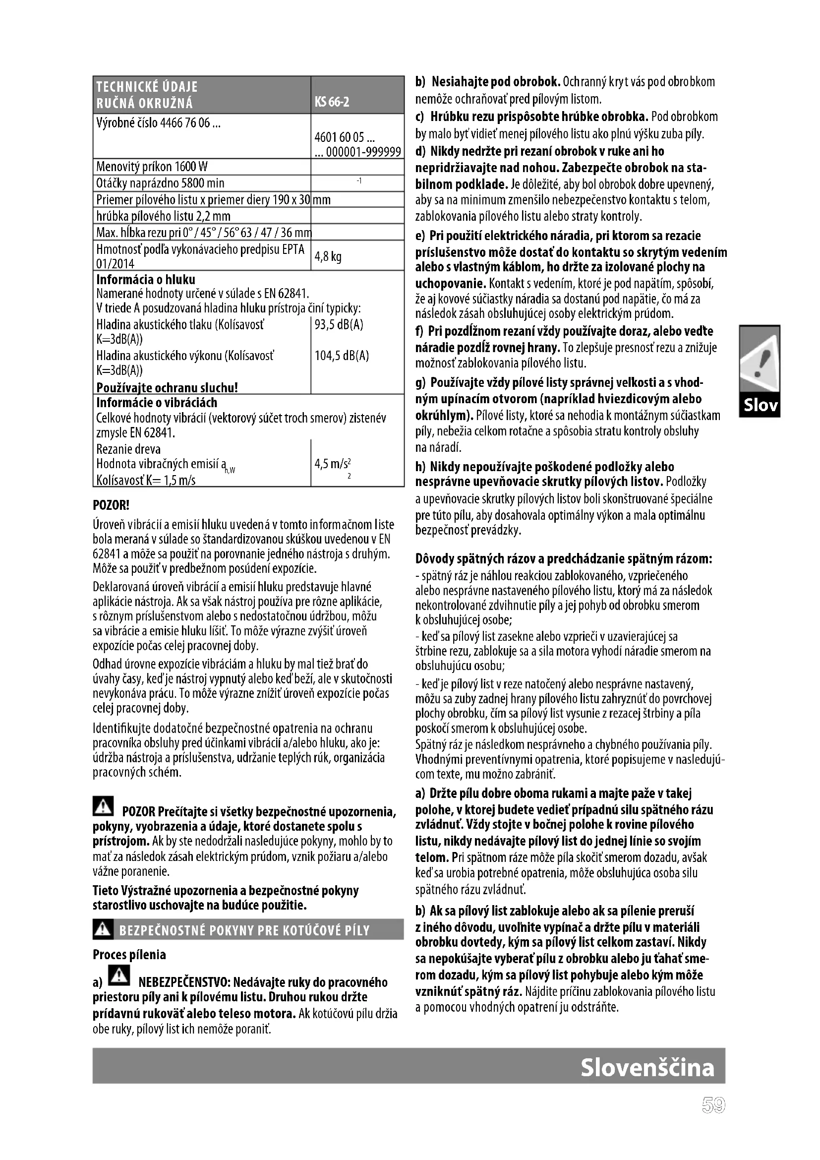 Priemer pílového listu x priemer diery 190 x 30 mm hrúbka pílového listu 2,2 mm Max. hĺbka rezu pri 0° / 45° / 56° 63 / 47 / 36 mm Hmotnosť podľa vykonávacieho predpisu EPTA 01/2014 4,8 kg Informácia o hluku Namerané hodnoty určené v súlade s EN 62841. V triede A posudzovaná hladina hluku prístroja činí typicky: Hladina akustického tlaku (Kolísavosť K=3dB(A)) 93,5 dB(A) Hladina akustického výkonu (Kolísavosť K=3dB(A)) 104,5 dB(A) Používajte ochranu sluchu! Informácie o vibráciách Celkové hodnoty vibrácií (vektorový súčet troch smerov) zistenév zmysle EN 62841. Rezanie dreva Hodnota vibračných emisií a h,W 4,5 m/s