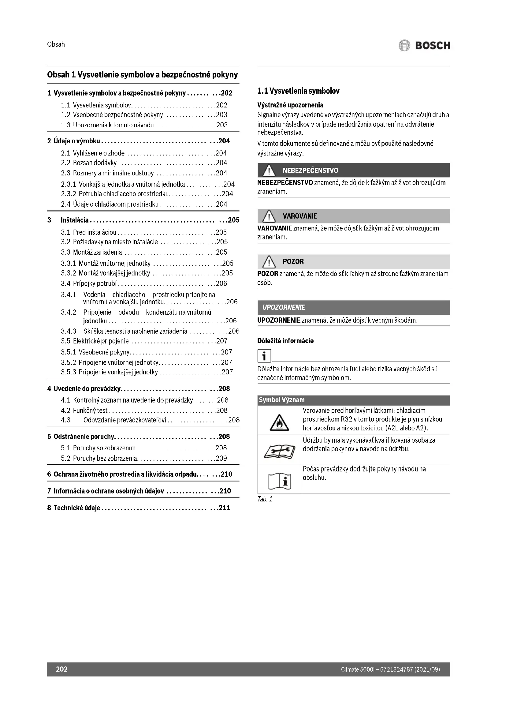 Výstražné upozornenia Signálne výrazy uvedené vo výstražných upozorneniach označujú druh a intenzitu následkov v prípade nedodržania opatrení na odvrátenie nebezpečenstva. V tomto dokumente sú definované a môžu byť použité nasledovné výstražné výrazy: NEBEZPEČENSTVO NEBEZPEČENSTVO znamená, že dôjde k ťažkým až život ohrozujúcim zraneniam. VAROVANIE VAROVANIE znamená, že môže dôjsť k ťažkým až život ohrozujúcim zraneniam. POZOR POZOR znamená, že môže dôjsť k ľahkým až stredne ťažkým zraneniam osôb. UPOZORNENIE UPOZORNENIE znamená, že môže dôjsť k vecným škodám. Dôležité informácie Dôležité informácie bez ohrozenia ľudí alebo rizika vecných škôd sú označené informačným symbolom. Tab. 1 1 Vysvetlenie symbolov a bezpečnostné pokyny . . . . . . . . . .202