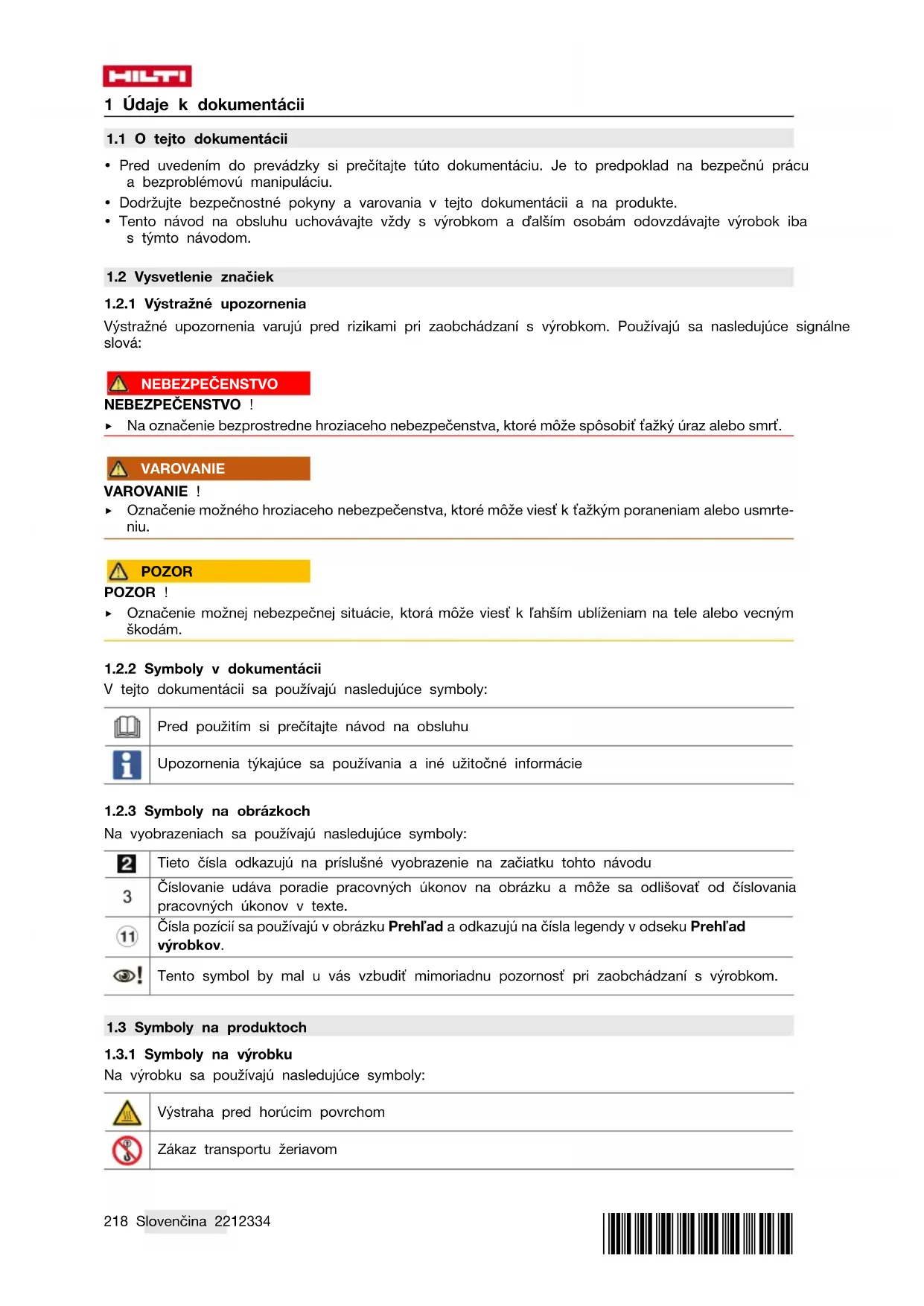 Na vlastnú zodpovednosť vyhlasujeme, že tu opísaný výrobok sa zhoduje s platnými smernicami a normami. Vyobrazenie vyhlásenia o zhode nájdete na konci tejto dokumentácie. Technická dokumentácia je uložená tu: Hilti Entwicklungsgesellschaft mbH | Zulassung Geräte | Hiltistraße 6 | 86916 Kaufering, DE 2 Bezpečnosť