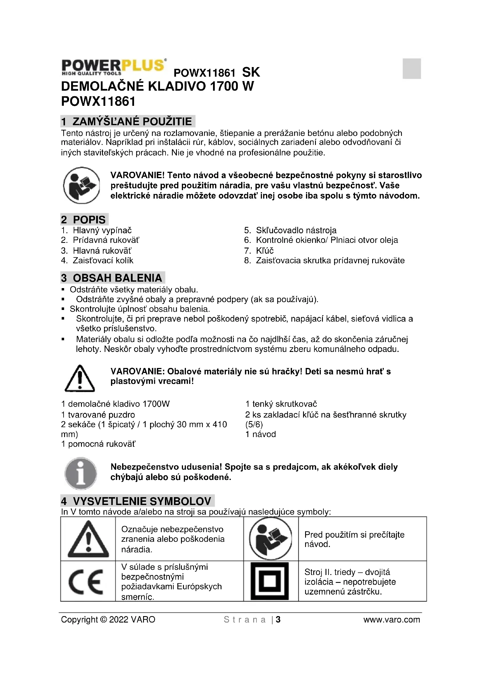 Vždy skontrolujte, či napätie napájacieho zdroja súhlasí s napätím na výkonnostnom štítkuPOWX11861 SK Copyright © 2022 VARO S t r a n a | 5 www.varo.com