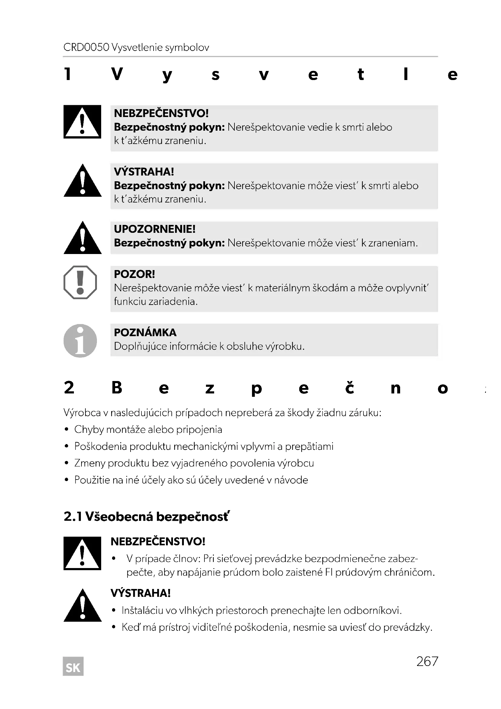 - Keď má prístroj viditeľné poškodenia, nesmie sa uviesť do prevádzky. NEBZPEČENSTVO! Bezpečnostný pokyn: Nerešpektovanie vedie k smrti alebo k t’ažkému zraneniu. VÝSTRAHA! Bezpečnostný pokyn: Nerešpektovanie môže viest’ k smrti alebo k t’ažkému zraneniu. UPOZORNENIE! Bezpečnostný pokyn: Nerešpektovanie môže viest’ k zraneniam. POZOR! Nerešpektovanie môže viest’ k materiálnym škodám a môže ovplyvnit’ funkciu zariadenia. POZNÁMKA Doplňujúce informácie k obsluhe výrobku. CRD0050--IO-16s.book Seite 267 Mittwoch, 16. August 2017 10:30 10SK Bezpečnostné pokyny CRD0050