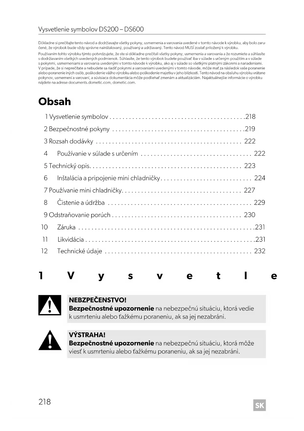 NEBZPEČENSTVO! Bezpečnostné upozornenie na nebezpečnú situáciu, ktorá vedie k usmrteniu alebo ťažkému poraneniu, ak sa jej nezabráni. VÝSTRAHA! Bezpečnostné upozornenie na nebezpečnú situáciu, ktorá môže viesť k usmrteniu alebo ťažkému poraneniu, ak sa jej nezabráni. DometicDS200-300-400-600_IOM_4445103315_EMEA16_2020-xx-xx.book Seite 218 Mittwoch, 3. März 2021 11:36 11SK DS200 – DS600 Bezpečnostné pokyny