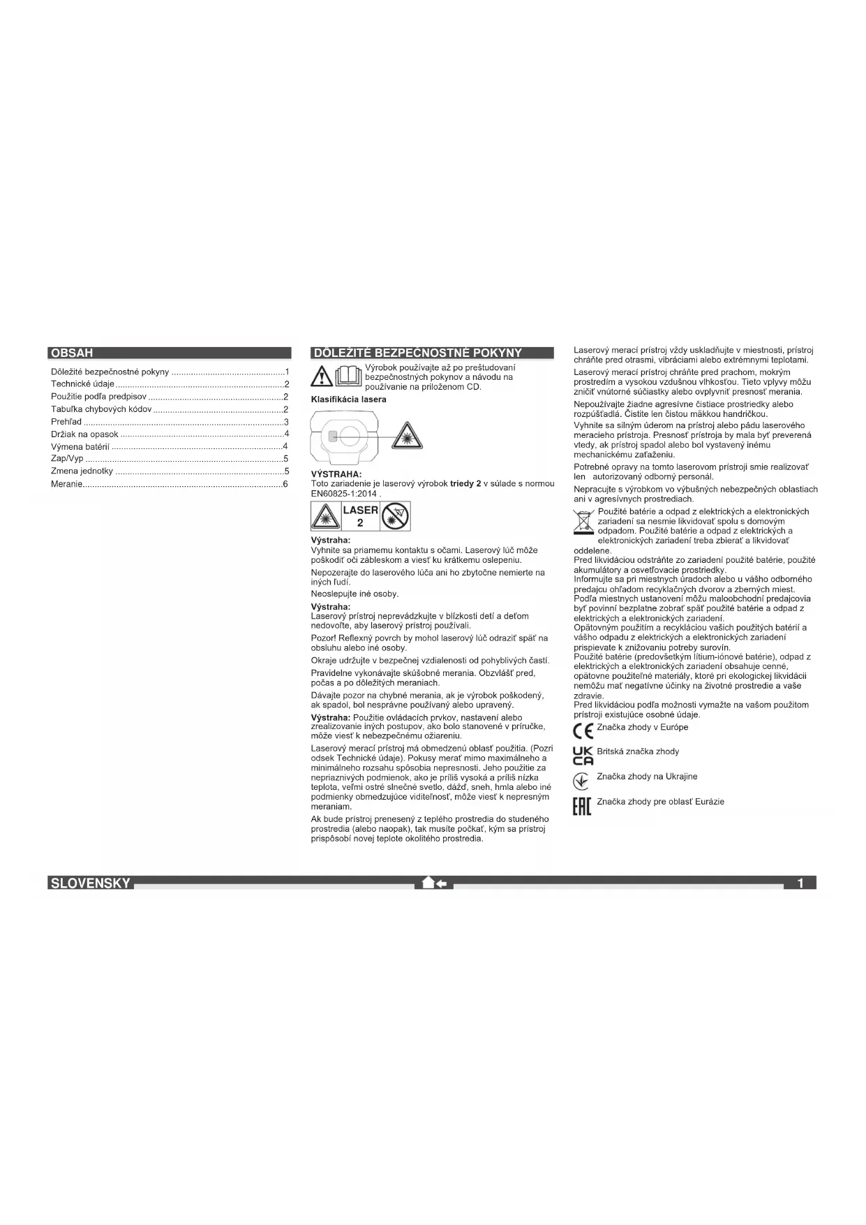 Výstraha: Vyhnite sa priamemu kontaktu s očami. Laserový lúč môže poškodiť oči zábleskom a viesť ku krátkemu oslepeniu. Nepozerajte do laserového lúča ani ho zbytočne nemierte na iných ľudí. Neoslepujte iné osoby. Výstraha: Laserový prístroj neprevádzkujte v blízkosti detí a deťom nedovoľte, aby laserový prístroj používali. Pozor! Reexný povrch by mohol laserový lúč odraziť späť na obsluhu alebo iné osoby. Okraje udržujte v bezpečnej vzdialenosti od pohyblivých častí. Pravidelne vykonávajte skúšobné merania. Obzvlášť pred, počas a po dôležitých meraniach. Dávajte pozor na chybné merania, ak je výrobok poškodený, ak spadol, bol nesprávne používaný alebo upravený. Výstraha: Použitie ovládacích prvkov, nastavení alebo zrealizovanie iných postupov, ako bolo stanovené v príručke, môže viesť k nebezpečnému ožiareniu. Laserový merací prístroj má obmedzenú oblasť použitia. (Pozri odsek Technické údaje). Pokusy merať mimo maximálneho a minimálneho rozsahu spôsobia nepresnosti. Jeho použitie za nepriaznivých podmienok, ako je príliš vysoká a príliš nízka teplota, veľmi ostré slnečné svetlo, dážď, sneh, hmla alebo iné podmienky obmedzujúce viditeľnosť, môže viesť k nepresným meraniam. Ak bude prístroj prenesený z teplého prostredia do studeného prostredia (alebo naopak), tak musíte počkať, kým sa prístroj prispôsobí novej teplote okolitého prostredia. Laserový merací prístroj vždy uskladňujte v miestnosti, prístroj chráňte pred otrasmi, vibráciami alebo extrémnymi teplotami. Laserový merací prístroj chráňte pred prachom, mokrým prostredím a vysokou vzdušnou vlhkosťou. Tieto vplyvy môžu zničiť vnútorné súčiastky alebo ovplyvniť presnosť merania. Nepoužívajte žiadne agresívne čistiace prostriedky alebo rozpúšťadlá. Čistite len čistou mäkkou handričkou. Vyhnite sa silným úderom na prístroj alebo pádu laserového meracieho prístroja. Presnosť prístroja by mala byť preverená vtedy, ak prístroj spadol alebo bol vystavený inému mechanickému zaťaženiu. Potrebné opravy na tomto laserovom prístroji smie realizovať len autorizovaný odborný personál. Nepracujte s výrobkom vo výbušných nebezpečných oblastiach ani v agresívnych prostrediach. Použité batérie a odpad z elektrických a elektronických zariadení sa nesmie likvidovať spolu s domovým odpadom. Použité batérie a odpad z elektrických a elektronických zariadení treba zbierať a likvidovať oddelene. Pred likvidáciou odstráňte zo zariadení použité batérie, použité akumulátory a osvetľovacie prostriedky. Informujte sa pri miestnych úradoch alebo u vášho odborného predajcu ohľadom recyklačných dvorov a zberných miest. Podľa miestnych ustanovení môžu maloobchodní predajcovia byť povinní bezplatne zobrať späť použité batérie a odpad z elektrických a elektronických zariadení. Opätovným použitím a recykláciou vašich použitých batérií a vášho odpadu z elektrických a elektronických zariadení prispievate k znižovaniu potreby surovín. Použité batérie (predovšetkým lítium-iónové batérie), odpad z elektrických a elektronických zariadení obsahuje cenné, opätovne použiteľné materiály, ktoré pri ekologickej likvidácii nemôžu mať negatívne účinky na životné prostredie a vaše zdravie. Pred likvidáciou podľa možnosti vymažte na vašom použitom prístroji existujúce osobné údaje. Značka zhody v Európe Britská značka zhody Značka zhody na Ukrajine Značka zhody pre oblasť Eurázie OBSAH Dôležité bezpečnostné pokyny ...............................................1 Technické údaje