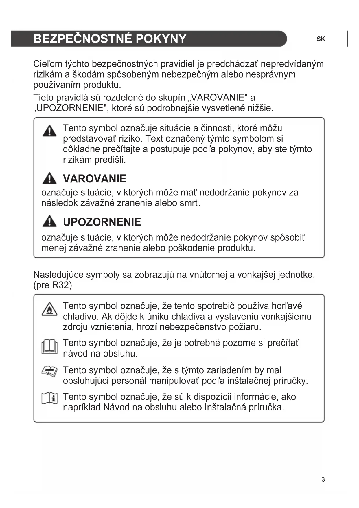 Cieľom týchto bezpečnostných pravidiel je predchádzať nepredvídaným rizikám a škodám spôsobeným nebezpečným alebo nesprávnym používaním produktu. Tieto pravidlá sú rozdelené do skupín „VAROVANIE" a „UPOZORNENIE", ktoré sú podrobnejšie vysvetlené nižšie. Tento symbol označuje situácie a činnosti, ktoré môžu predstavovať riziko. Text označený týmto symbolom si dôkladne prečítajte a postupuje podľa pokynov, aby ste týmto rizikám predišli. VAROVANIE označuje situácie, v ktorých môže mať nedodržanie pokynov za následok závažné zranenie alebo smrť. UPOZORNENIE označuje situácie, v ktorých môže nedodržanie pokynov spôsobiť menej závažné zranenie alebo poškodenie produktu. Nasledujúce symboly sa zobrazujú na vnútornej a vonkajšej jednotke. (pre R32) Tento symbol označuje, že tento spotrebič používa horľavé chladivo. Ak dôjde k úniku chladiva a vystaveniu vonkajšiemu zdroju vznietenia, hrozí nebezpečenstvo požiaru. Tento symbol označuje, že je potrebné pozorne si prečítať návod na obsluhu. Tento symbol označuje, že s týmto zariadením by mal obsluhujúci personál manipulovať podľa inštalačnej príručky. Tento symbol označuje, že sú k dispozícii informácie, ako napríklad Návod na obsluhu alebo Inštalačná príručka.4