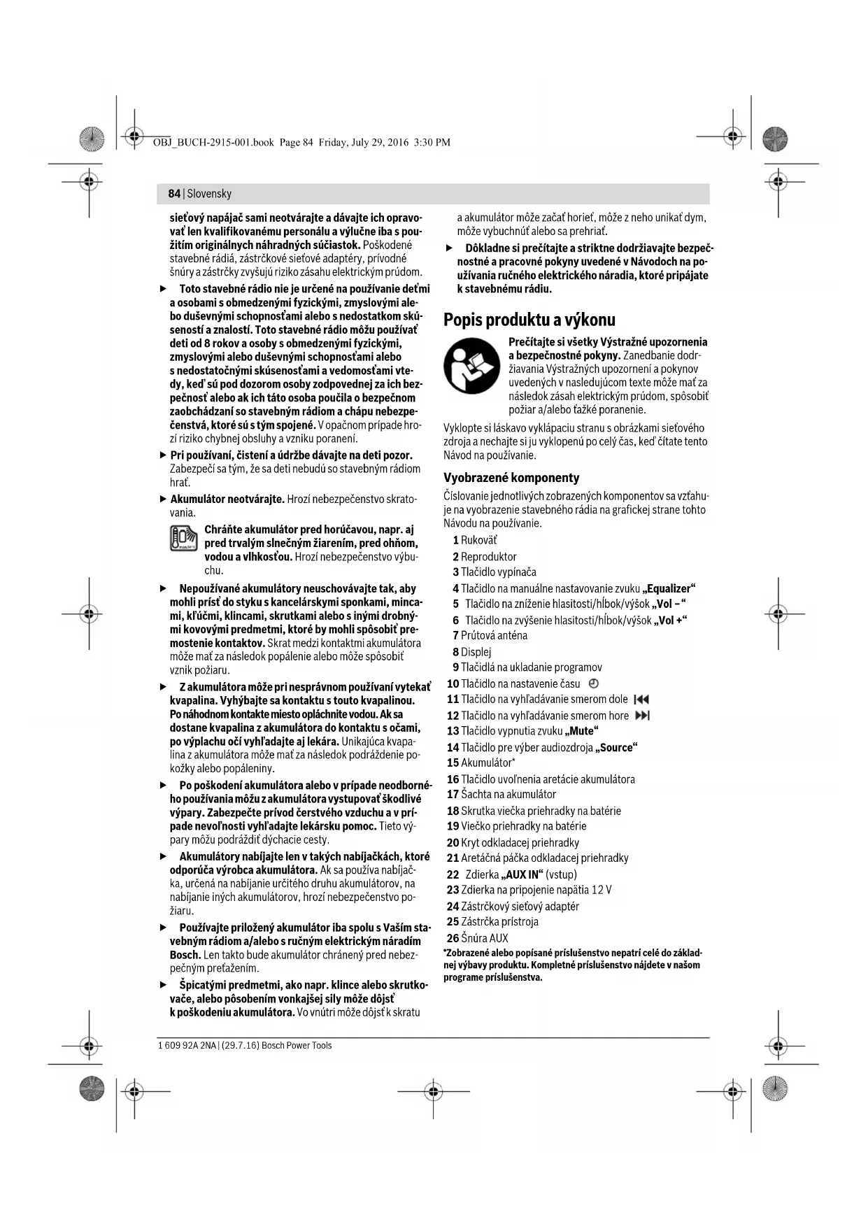 Technické údaje určené pomocou akumulátora, ktorý je súčasťou balenia. Zástrčkový sieťový adaptér Vecné číslo 1 600 A00 0.. Vstupné napätie V~ 100–240 Frekvencia Hz 50/60 Vstupný prúd mA 500 Výstupné napätie V= 12 Výstupný prúd mA 1500 Hmotnosť podľa EPTA-Procedure 01:2014 kg 0,20 Trieda ochrany /II Indikácia Kapacita 2/3 1/3 <1/3 Rezerva Akumulátor vybitý OBJ_BUCH-2915-001.book Page 85 Friday, July 29, 2016 3:30 PM86 | Slovensky 1 609 92A 2NA | (29.7.16) Bosch Power Tools Na ochranu proti znečisteniu nasaďte ochranný kryt pripája- cieho konektora 12 V 23 opäť na miesto, keď ste zástrčku (ko- nektor) odstránili. Keď zástrčkový sieťový adaptér 24 nepoužívate, môžete ho mať odložený v odkladacej priehradke stavebného rádia. Ot- vorte na tento účel aretačnú páčku 21 a vyklopte kryt 20 od- kladacej priehradky. Vkladanie/výmena záložných batérií Aby sa zachoval v pamäti stavebného rádia správny hodinový čas, musia byť doň vložené záložné batérie. Na tento účel od- porúčame používanie alkalicko-mangánových batérií. Na otvorenie priehradky na batérie uvoľnite skrutkue 18 a viečko priehradky na batérie 19 odoberte. Vložte záložné ba- térie. Dajte pritom pozor na správne pólovanie podľa vyobra- zenia na vnútornej strane viečka priehradky na batérie. Viečko priehradky na batérie 19 opäť založte a priskrutkujte ho pomocou skrutky 18. Záložné batérie nahraďte za nové vtedy, keď začne časová in- dikácia e blikať a hodinový čas na stavebnom rádiu sa už nedá uložiť do pamäte. Vymieňajte vždy všetky batérie súčasne. Pri jednej výmene používajte len batérie jedného výrobcu a vždy také, ktoré ma- jú rovnakú kapacitu. Keď stavebné rádio dlhší čas nepoužívate, vyberte z neho záložné batérie. Počas dlhšieho skladovania by mohli záložné batérie korodovať a mohli by sa aj samočin- ne vybíjať. Používanie Chráňte si stavebné rádio pred vlhkom a pred priamym slnečným žiarením. Toto stavebné rádio je vhodné len na používanie v suchých vnútorných priestoroch. Audioprevádzka Zapínanie/vypínanie Na zapnutie stavebného rádia stlačte tlačidlo vypínača 3. Displej 8 sa aktivuje a spustí sa prevádzka (prehrávanie skla- dieb) z toho audiozdroja, ktorý bol nastavený pri poslednom vypnutí stavebného rádia. Upozornenie: Pri prvom použití s akumulátorom alebo po dl- hej prestávke v používaní stavebného rádia môže byť potreb- né stlačiť na zapnutie tlačidlo vypínača 3 viackrát, alebo ho bude treba podržať stlačené dlhšie. Displej 8 sa pri každom stlačení tlačidla na niekoľko sekúnd rozsvieti. Na vypnutie stavebného rádia stlačte znova tlačidlo vypínača