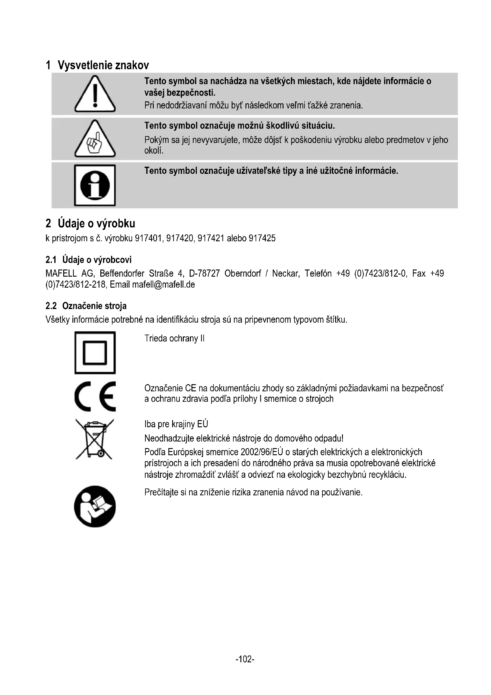 Tento symbol označuje užívateľské tipy a iné užitočné informácie. 2 Údaje o výrobku k prístrojom s č. výrobku 917401, 917420, 917421 alebo 917425