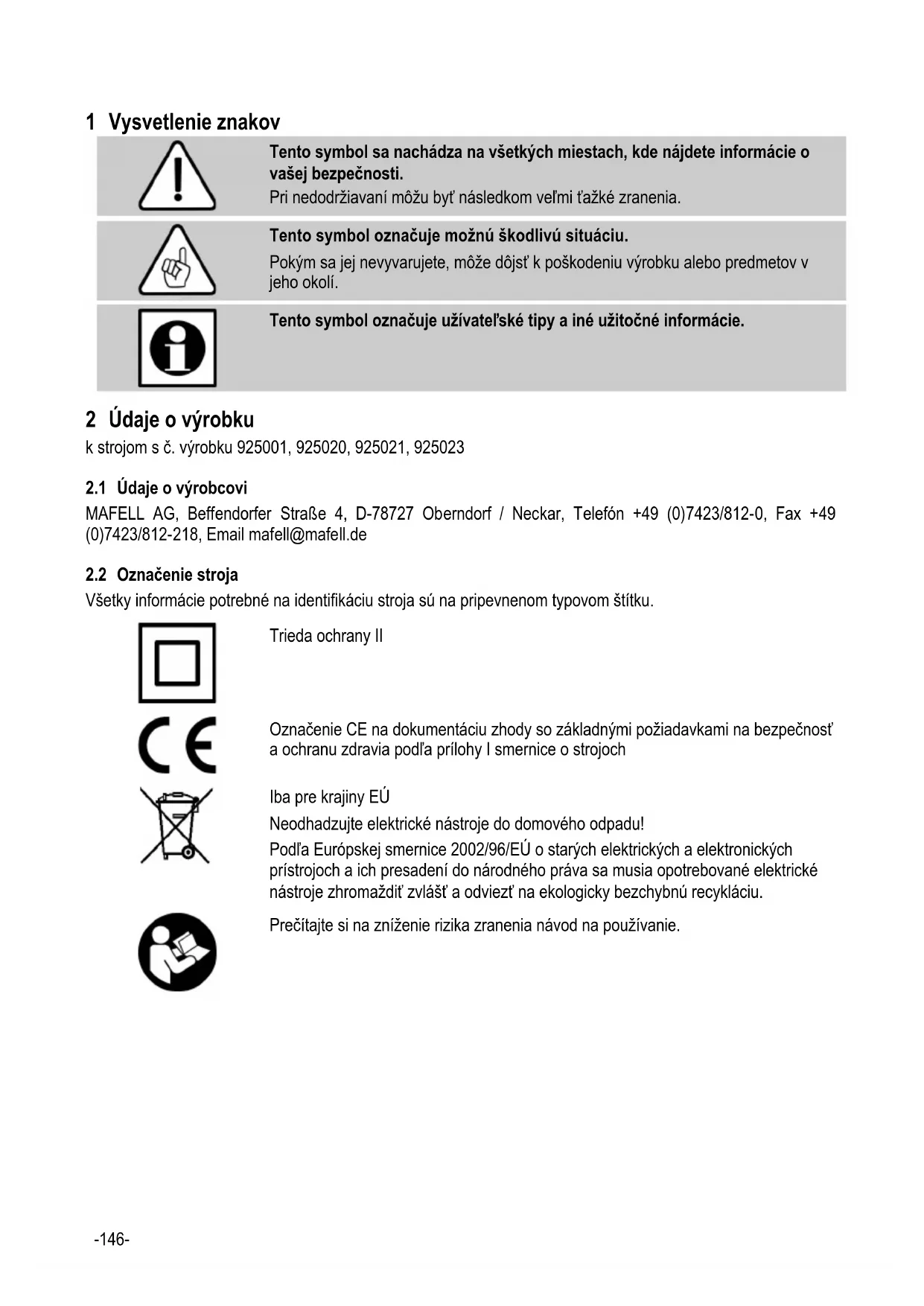 Tento symbol označuje užívateľské tipy a iné užitočné informácie. 2 Údaje o výrobku k strojom s č. výrobku 925001, 925020, 925021, 925023