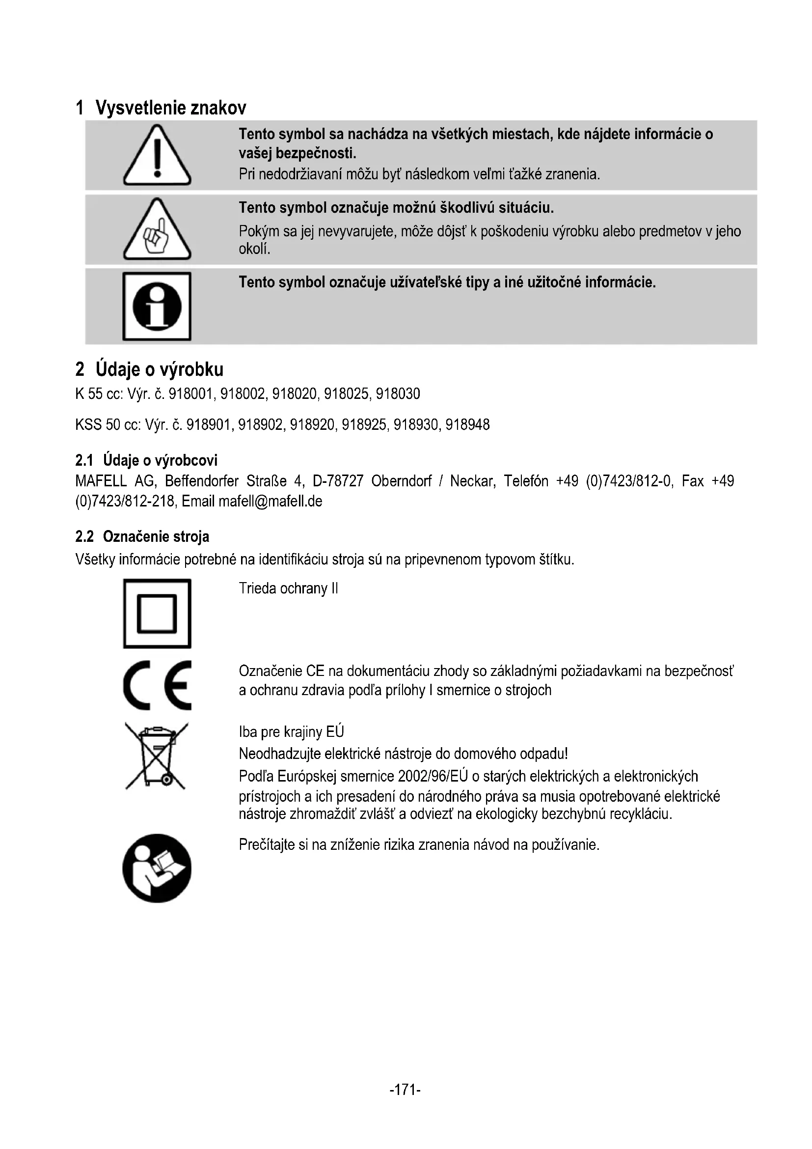 Tento symbol označuje užívateľské tipy a iné užitočné informácie. 2 Údaje o výrobku K 55 cc: Výr. č. 918001, 918002, 918020, 918025, 918030 KSS 50 cc: Výr. č. 918901, 918902, 918920, 918925, 918930, 918948