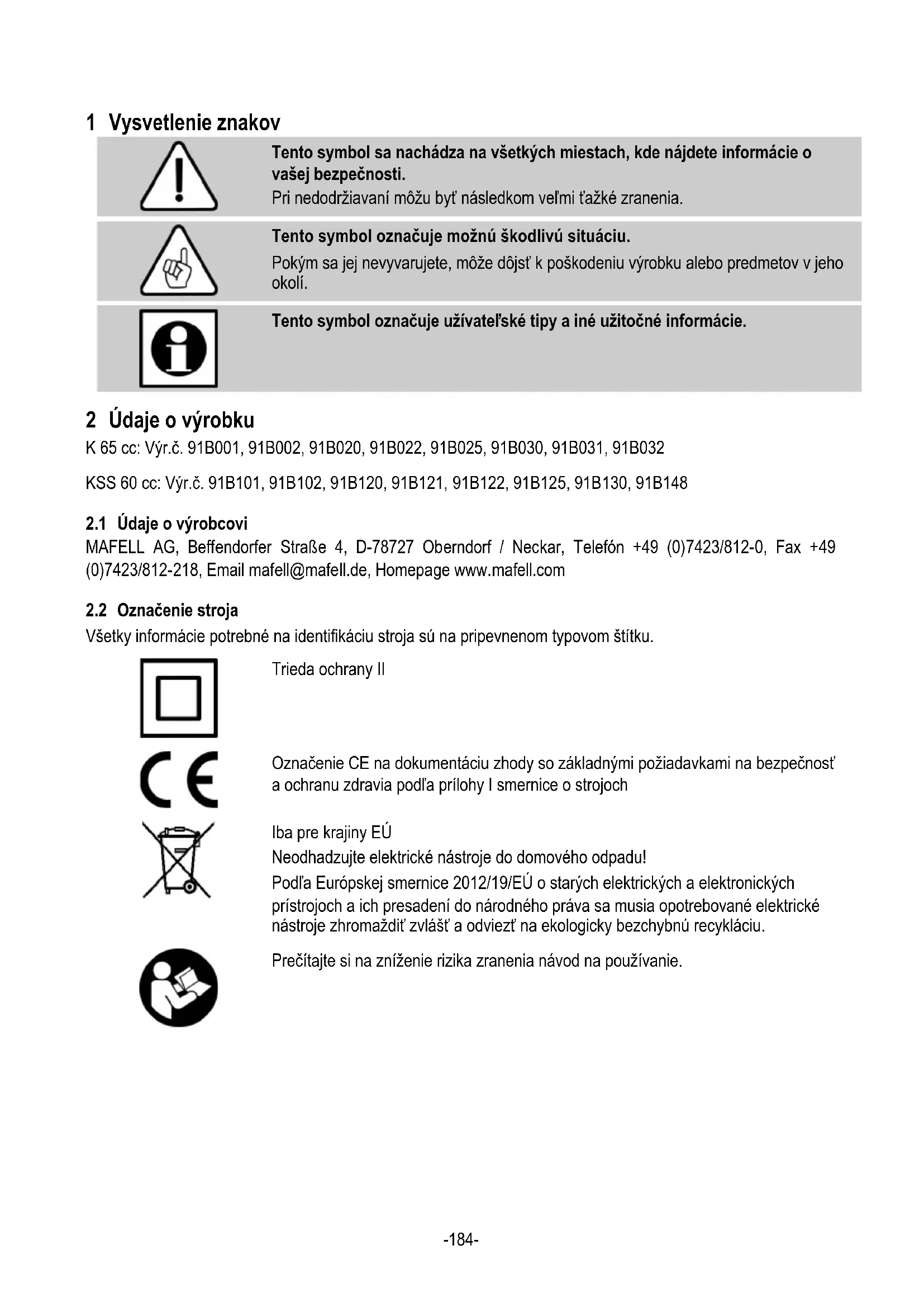 Tento symbol označuje užívateľské tipy a iné užitočné informácie. 2 Údaje o výrobku K 65 cc: Výr.č. 91B001, 91B002, 91B020, 91B022, 91B025, 91B030, 91B031, 91B032 KSS 60 cc: Výr.č. 91B101, 91B102, 91B120, 91B121, 91B122, 91B125, 91B130, 91B148