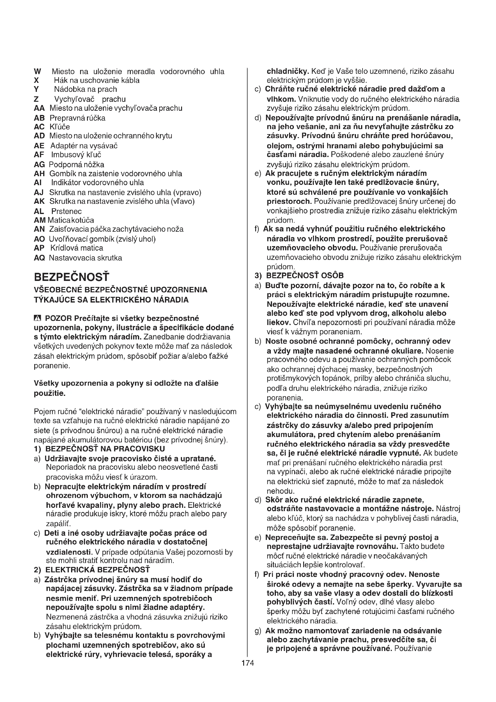 a) Buďte pozorní, dávajte pozor na to, čo robíte a k práci s elektrickým náradím pristupujte rozumne. Nepoužívajte elektrické náradie, keď ste unavení alebo keď ste pod vplyvom drog, alkoholu alebo liekov. Chvíľa nepozornosti pri používaní náradia môže viesť k vážnym poraneniam. b) Noste osobné ochranné pomôcky, ochranný odev a vždy majte nasadené ochranné okuliare. Nosenie pracovného odevu a používanie ochranných pomôcok ako ochrannej dýchacej masky, bezpečnostných protišmykových topánok, prilby alebo chrániča sluchu, podľa druhu elektrického náradia, znižuje riziko poranenia. c) Vyhýbajte sa neúmyselnému uvedeniu ručného elektrického náradia do činnosti. Pred zasunutím zástrčky do zásuvky a/alebo pred pripojením akumulátora, pred chytením alebo prenášaním ručného elektrického náradia sa vždy presvedčte sa, či je ručné elektrické náradie vypnuté. Ak budete mať pri prenášaní ručného elektrického náradia prst na vypínači, alebo ak ručné elektrické náradie pripojíte na elektrickú sieť zapnuté, môže to mať za následok nehodu. d) Skôr ako ručné elektrické náradie zapnete, odstráňte nastavovacie a montážne nástroje. Nástroj alebo kľúč, ktorý sa nachádza v pohyblivej časti náradia, môže spôsobiť poranenie. e) Nepreceňujte sa. Zabezpečte si pevný postoj a neprestajne udržiavajte rovnováhu. Takto budete môcť ručné elektrické náradie v neočakávaných situáciách lepšie kontrolovať. f) Pri práci noste vhodný pracovný odev. Nenoste široké odevy a nemajte na sebe šperky. Vyvarujte sa toho, aby sa vaše vlasy a odev dostali do blízkosti pohyblivých častí. Voľný odev, dlhé vlasy alebo šperky môžu byť zachytené rotujúcimi časťami ručného elektrického náradia. g) Ak možno namontovať zariadenie na odsávanie alebo zachytávanie prachu, presvedčíte sa, či je pripojené a správne používané. Používanie W Miesto na uloženie meradla vodorovného uhla X Hák na uschovanie kábla Y Nádobka na prach Z Vychyľovač prachu AA Miesto na uloženie vychyľovača prachu AB Prepravná rúčka AC Kľúče AD Miesto na uloženie ochranného krytu AE Adaptér na vysávač AF Imbusový kľuč AG Podporná nôžka AH Gombík na zaistenie vodorovného uhla AI Indikátor vodorovného uhla AJ Skrutka na nastavenie zvislého uhla (vpravo) AK Skrutka na nastavenie zvislého uhla (vľavo) AL Prstenec AM Matica kotúča AN Zaisťovacia páčka zachytávacieho noža AO Uvoľňovací gombík (zvislý uhol) AP Krídlová matica AQ Nastavovacia skrutka BEZPEČNOSŤ