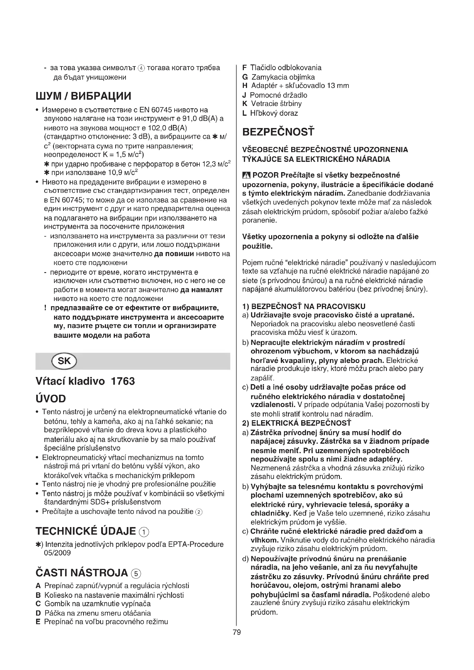 A Prepínač zapnúť/vypnúť a regulácia rýchlosti B Koliesko na nastavenie maximálni rýchlosti C Gombík na uzamknutie vypínača D Páčka na zmenu smeru otáčania E Prepínač na voľbu pracovného režimu F Tlačidlo odblokovania G Zamykacia objímka H Adaptér + skľučovadlo 13 mm J Pomocné držadlo K Vetracie štrbiny L Hľbkový doraz BEZPEČNOSŤ