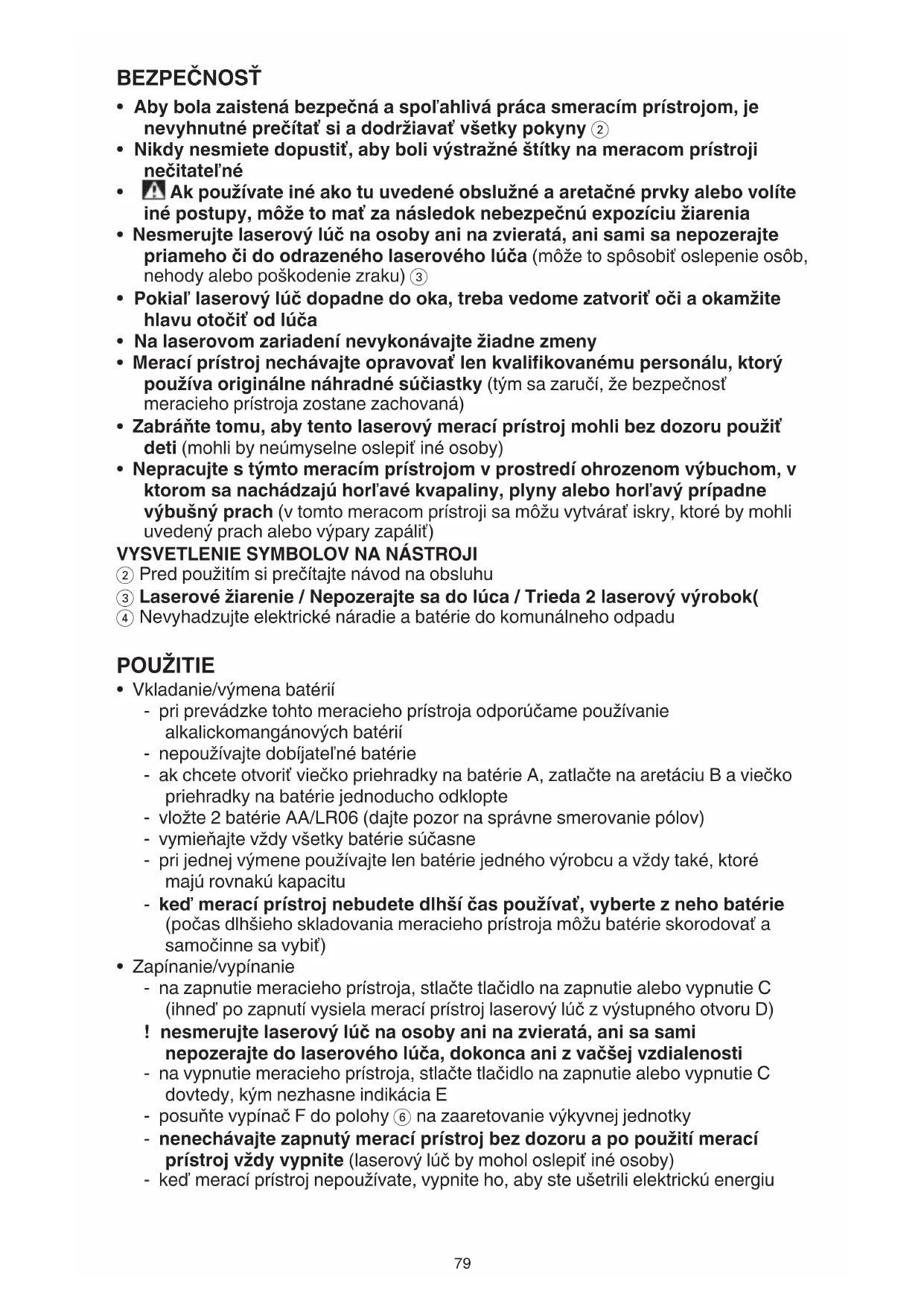 - Zapínanie/vypínanie - na zapnutie meracieho prístroja, stlačte tlačidlo na zapnutie alebo vypnutie C (ihneď po zapnutí vysiela merací prístroj laserový lúč z výstupného otvoru D) ! nesmerujtelaserovýlúčnaosobyaninazvieratá,anisasami nepozerajtedolaserovéholúča,dokoncaanizvačšejvzdialenosti - na vypnutie meracieho prístroja, stlačte tlačidlo na zapnutie alebo vypnutie C dovtedy, kým nezhasne indikácia E - posuňte vypínač F do polohy 6 na zaaretovanie výkyvnej jednotky - nenechávajtezapnutýmeracíprístrojbezdozoruapopoužitímerací prístrojvždyvypnite (laserový lúč by mohol oslepiť iné osoby) - keď merací prístroj nepoužívate, vypnite ho, aby ste ušetrili elektrickú energiu80