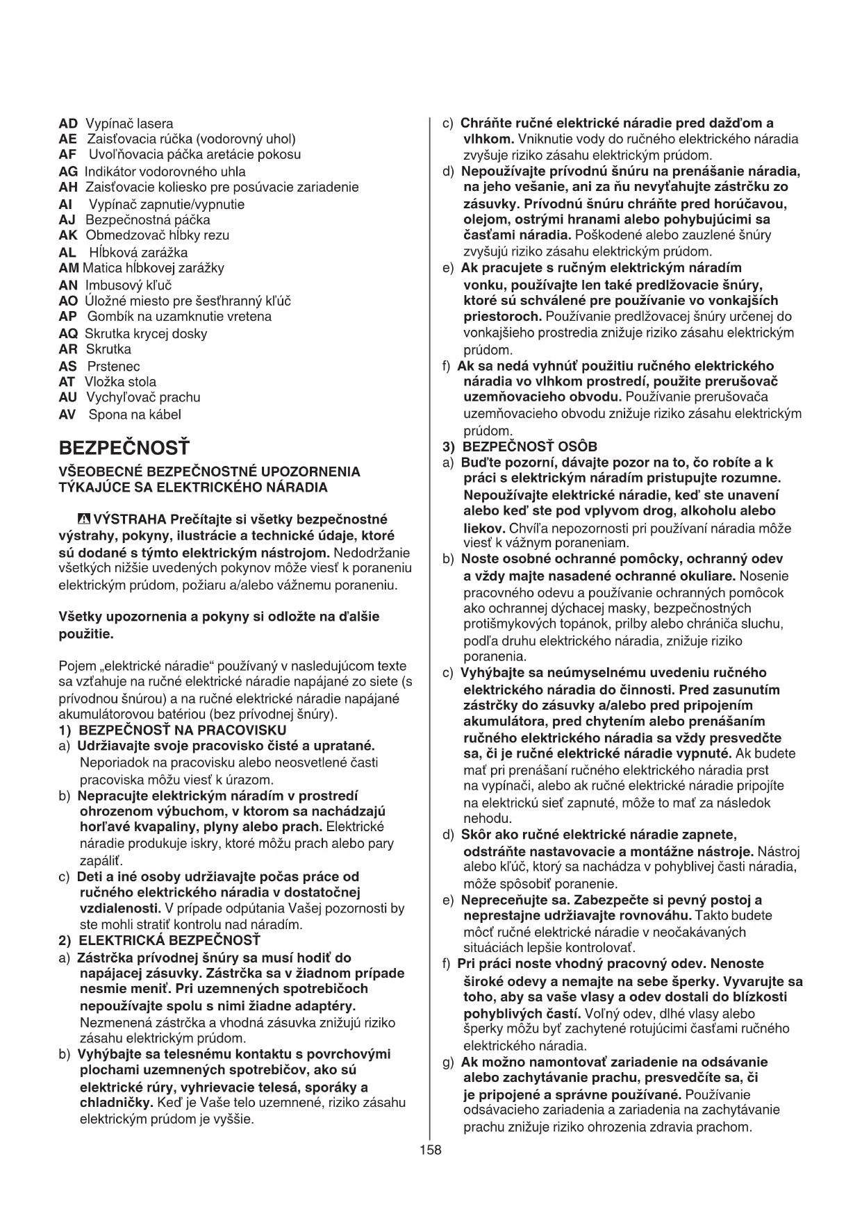 a) Buďte pozorní, dávajte pozor na to, čo robíte a k práci s elektrickým náradím pristupujte rozumne. Nepoužívajte elektrické náradie, keď ste unavení alebo keď ste pod vplyvom drog, alkoholu alebo liekov. Chvíľa nepozornosti pri používaní náradia môže viesť k vážnym poraneniam. b) Noste osobné ochranné pomôcky, ochranný odev a vždy majte nasadené ochranné okuliare. Nosenie pracovného odevu a používanie ochranných pomôcok ako ochrannej dýchacej masky, bezpečnostných protišmykových topánok, prilby alebo chrániča sluchu, podľa druhu elektrického náradia, znižuje riziko poranenia. c) Vyhýbajte sa neúmyselnému uvedeniu ručného elektrického náradia do činnosti. Pred zasunutím zástrčky do zásuvky a/alebo pred pripojením akumulátora, pred chytením alebo prenášaním ručného elektrického náradia sa vždy presvedčte sa, či je ručné elektrické náradie vypnuté. Ak budete mať pri prenášaní ručného elektrického náradia prst na vypínači, alebo ak ručné elektrické náradie pripojíte na elektrickú sieť zapnuté, môže to mať za následok nehodu. d) Skôr ako ručné elektrické náradie zapnete, odstráňte nastavovacie a montážne nástroje. Nástroj alebo kľúč, ktorý sa nachádza v pohyblivej časti náradia, môže spôsobiť poranenie. e) Nepreceňujte sa. Zabezpečte si pevný postoj a neprestajne udržiavajte rovnováhu. Takto budete môcť ručné elektrické náradie v neočakávaných situáciách lepšie kontrolovať. f) Pri práci noste vhodný pracovný odev. Nenoste široké odevy a nemajte na sebe šperky. Vyvarujte sa toho, aby sa vaše vlasy a odev dostali do blízkosti pohyblivých častí. Voľný odev, dlhé vlasy alebo šperky môžu byť zachytené rotujúcimi časťami ručného elektrického náradia. g) Ak možno namontovať zariadenie na odsávanie alebo zachytávanie prachu, presvedčíte sa, či je pripojené a správne používané. Používanie odsávacieho zariadenia a zariadenia na zachytávanie prachu znižuje riziko ohrozenia zdravia prachom. AD Vypínač lasera AE Zaisťovacia rúčka (vodorovný uhol) AF Uvoľňovacia páčka aretácie pokosu AG Indikátor vodorovného uhla AH Zaisťovacie koliesko pre posúvacie zariadenie AI Vypínač zapnutie/vypnutie AJ Bezpečnostná páčka AK Obmedzovač hĺbky rezu AL Hĺbková zarážka AM Matica hĺbkovej zarážky AN Imbusový kľuč AO Úložné miesto pre šesťhranný kľúč AP Gombík na uzamknutie vretena AQ Skrutka krycej dosky AR Skrutka AS Prstenec AT Vložka stola AU Vychyľovač prachu AV Spona na kábel BEZPEČNOSŤ