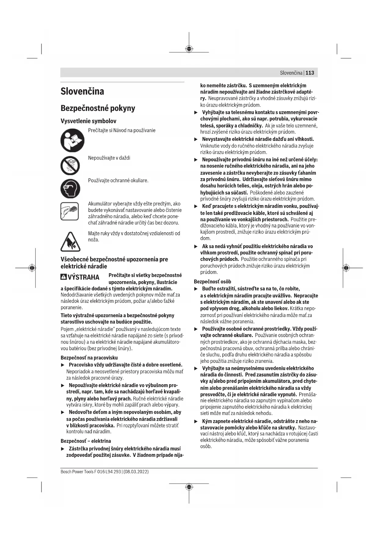 Uvedené celkové hodnoty emisie vibrácií a namerané hod- noty emisie hluku boli zisťované testami podľa normy a mož- no ich použiť aj na porovnanie elektrického náradia s iným. Uvedené celkové hodnoty vibrácií a uvedené hodnoty emisie hluku môžu slúžiť aj na predbežný odhad zaťaženia náradia. Hodnoty emisie vibrácií a emisie hluku počas skutočného popiužívania náradia sa môžu od uvedených hodnôt odlišo- vať podľa toho, akým spôsobom sa náradie používa, aký druh obrobka sa používa - aby sa zaručili bezpečnostné opa- trenia v prospech obsluhy, ktoré sa vzťahujú na konkrétne použitie náradia (tu treba zohľadniť aj všetky časti pracovné- ho cyklu, napríklad doby, počas ktorých je náradie vypnuté a takisto doby, keď je síce zapnuté, ale beží bez zaťaženia). Uvedenie do prevádzky Pre Vašu bezpečnosť u Pozor: Záhradné náradie vypínajte a akumulátor vybe- rajte vždy ešte predtým, ako budete vykonávať na- stavovacie práce alebo čistenie náradia. u Po vypnutí nožníc na živý plot sa nože ešte niekoľko zlomkov sekundy pohybujú ďalej. u Nedotýkajte sa pohybujúcich sa nožov. Nabíjanie akumulátorov u Dodržiavajte napätie elektrickej siete! Napätie zdroja prúdu musí mať hodnotu zhodnú s údajmi na typovom štítku nabíjačky. Akumulátor je vybavený tepelnou poistkou, ktorá dovolí na- bíjanie akumulátora len v rozsahu teplôt medzi 0 °C a 35 °C. Vďaka tomu sa dosiahne vyššia životnosť akumulátora. Upozornenie: Akumulátor sa dodáva včiastočne nabitom stave. Aby ste zaručili plný výkon akumulátora, pred prvým použitím akumulátor v nabíjačke celkom nabite. Lítiovo-iónové akumulátory možno kedykoľvek dobíjať bez toho, aby to skrátilo ich životnosť. Prerušenie nabíjania taký- to akumulátor nepoškodzuje. Lítiovo-iónový akumulátor je chránený proti hlbokému vybi- tiu pomocou elektronickej ochrany článku „Electronic Cell Protection (ECP)“. Keď je akumulátor vybitý, výrobok sa po- mocou ochranného obvodu samočinne vypne: Záhradnícke náradie už nepracuje. Po automatickom vypnutí náradia už viac vypínač nestlá- čajte. Akumulátor sa môže poškodiť. Dodržiavajte upozornenia týkajúce sa likvidácie akumuláto- ra. Vkladanie/vyberanie akumulátora (pozri obrázok B) Upozornenie: Ak sa nepoužijú vhodné akumulátory, môže to viesť k nesprávnemu fungovaniu alebo k poškodeniu prí- stroja. Vložte nabitý akumulátor (9). Postarajte sa o to, aby bol aku- mulátor úplne vložený. Ak chcete akumulátor vybrať (9) z prístroja, stlačte uvoľňo- vacie tlačidlo (7) a akumulátor vyberte. Obsluha Zapnúť/vypnúť (pozri obrázky D − C) Hneď po vložení akumulátora apočuteľnom „kliknutí“ (pozri obrázok B) stlačte na zapnutie produktu spoločne spínač vpredu (3) aspínač na zadnej rukoväti (2). Na vypnutie produktu pustite spínač na zadnej rukoväti (2) alebo spínač vpredu (3) alebo oba spínače naraz. Bosch Power Tools F 016 L94 293 | (08.03.2022)118 | Slovenčina Rezacia funkcia Napriek tomu, že na základe vzdialenosti zubov môžno strihať konáre až do hrúbky 28 mm, môžete prednú časť strihacej lišty použiť aj na hrubšie krovie. Práca s nožnicami na živý plot (pozri obrázok E) Pohybujte nožnice na živý plot rovnomerne priamočiaro do- predu. Dvojstranný nožový mechanizmus umožňuje strih v oboch smeroch alebo pri kývavom pohybe strihanie z jednej strany na druhú. Najprv ostrihajte bočné strany živého plota, potom hornú hranu. Aby ste mali strany rovné, odporúčame Vám strihať v smere rastu zdola smerom hore. Keď sa strihá zhora smerom dole, tenké konáre sa pohybujú smerom von, následkom čoho mô- žu vznikať redšie miesta alebo diery. Aby sa napokon ostrihala horná hrana živého plotu rov- nomerne, odporúčame napnúť po celej dĺžke živého plota do požadovanej výšky nejakú šnúru. Dajte pozor na to, aby ste neporezali žiadne predmety, napr. drôty. Môže sa poškodiť nôž alebo pohon. Antiblokovací mechanizmus Keď sa strihacia čepeľ zablokuje vodolnom materiáli, tak sa zvýši zaťaženie motora. Inteligentná mikroelektronika identi- fikuje túto situáciu preťaženia a opakovane mení smer otáča- nia motora, aby zabránila blokovaniu rezacích nožov a aby náradie spomínaný materiál preseklo. Keď stlačíte spínač trvá toto počuteľné prepnutie až 6 ob- rátok. Po preseknutí pracuje záhradné náradie vnormálnom režime ďalej, alebo sa strihacia čepeľ pri pretrvávajúcej situácii preťaženia automaticky zastaví votvorenom stave (napr. ak omylom kus kovového plota zablokuje záhradné náradie). Hľadanie porúch Nožnice na živý plot Symptóm Možná príčina Odstránenie príčiny Nožnice na živý plot nebežia Akumulátor je vybitý Akumulátor nabite, pozri aj „Pokyny pre nabíja- nie“ Akumulátor nie je vložený správne Postarajte sa o to, aby boli oba blokovacie stupne zaskočené Nožnice na živý plot bežia prerušovane Vnútorná kabeláž záhradného náradia je poru- šená Vyhľadajte autorizovanú servisnú opravovňu Porucha vypínača Vyhľadajte autorizovanú servisnú opravovňu Smer otáčania motora sa stále mení a po cca 3 sekundách motor zastane pozri „Pracovné pokyny“ (Antiblokovací mecha- nizmus) Motor beží, nože zostá- vajú stáť Interná porucha Vyhľadajte autorizovanú servisnú opravovňu Nože sa príliš zahrieva-