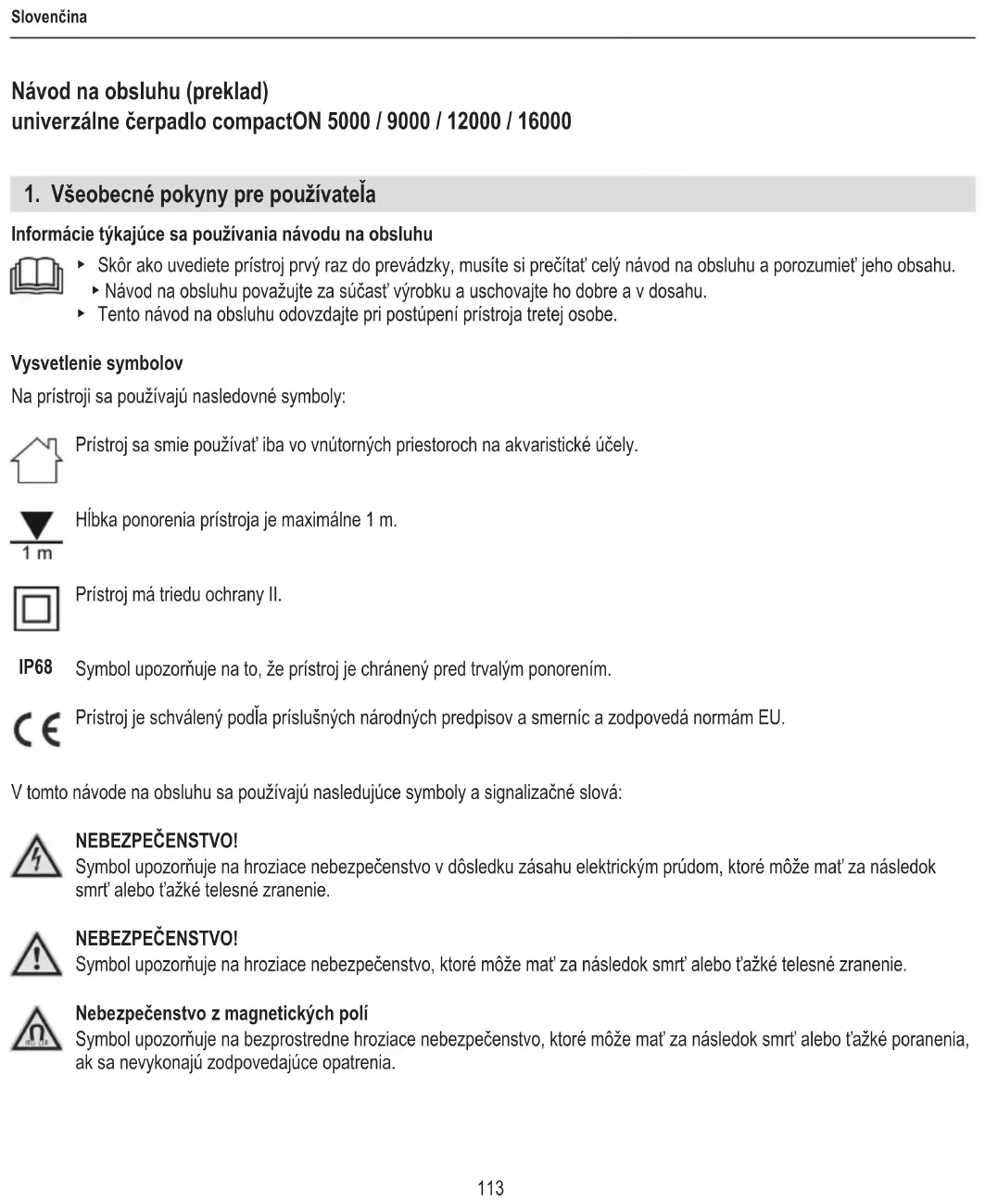 Informácie týkajúce sa používania návodu na obsluhu ▶ Skôr ako uvediete prístroj prvý raz do prevádzky, musíte si prečítať celý návod na obsluhu a porozumieť jeho obsahu. ▶ Návod na obsluhu považujte za súčasť výrobku a uschovajte ho dobre a v dosahu. ▶ Tento návod na obsluhu odovzdajte pri postúpení prístroja tretej osobe. Vysvetlenie symbolov Na prístroji sa používajú nasledovné symboly: Prístroj sa smie používať iba vo vnútorných priestoroch na akvaristické účely. Hĺbka ponorenia prístroja je maximálne 1 m. Prístroj má triedu ochrany II. Symbol upozorňuje na to, že prístroj je chránený pred trvalým ponorením. Prístroj je schválený podľa príslušných národných predpisov a smerníc a zodpovedá normám EU. V tomto návode na obsluhu sa používajú nasledujúce symboly a signalizačné slová: NEBEZPEČENSTVO! Symbol upozorňuje na hroziace nebezpečenstvo v dôsledku zásahu elektrickým prúdom, ktoré môže mať za následok smrť alebo ťažké telesné zranenie. NEBEZPEČENSTVO! Symbol upozorňuje na hroziace nebezpečenstvo, ktoré môže mať za následok smrť alebo ťažké telesné zranenie. Nebezpečenstvo z magnetických polí Symbol upozorňuje na bezprostredne hroziace nebezpečenstvo, ktoré môže mať za následok smrť alebo ťažké poranenia, ak sa nevykonajú zodpovedajúce opatrenia. IP68114 Slovenčina VAROVANIE! Symbol upozorňuje na hroziace nebezpečenstvo, ktoré môže mať za následok stredné až ľahké telesné zranenia alebo zdravotné riziko. POZOR! Symbol upozorňuje na nebezpečenstvo vecných škôd. Upozornenie s užitočnými informáciami a tipmi.