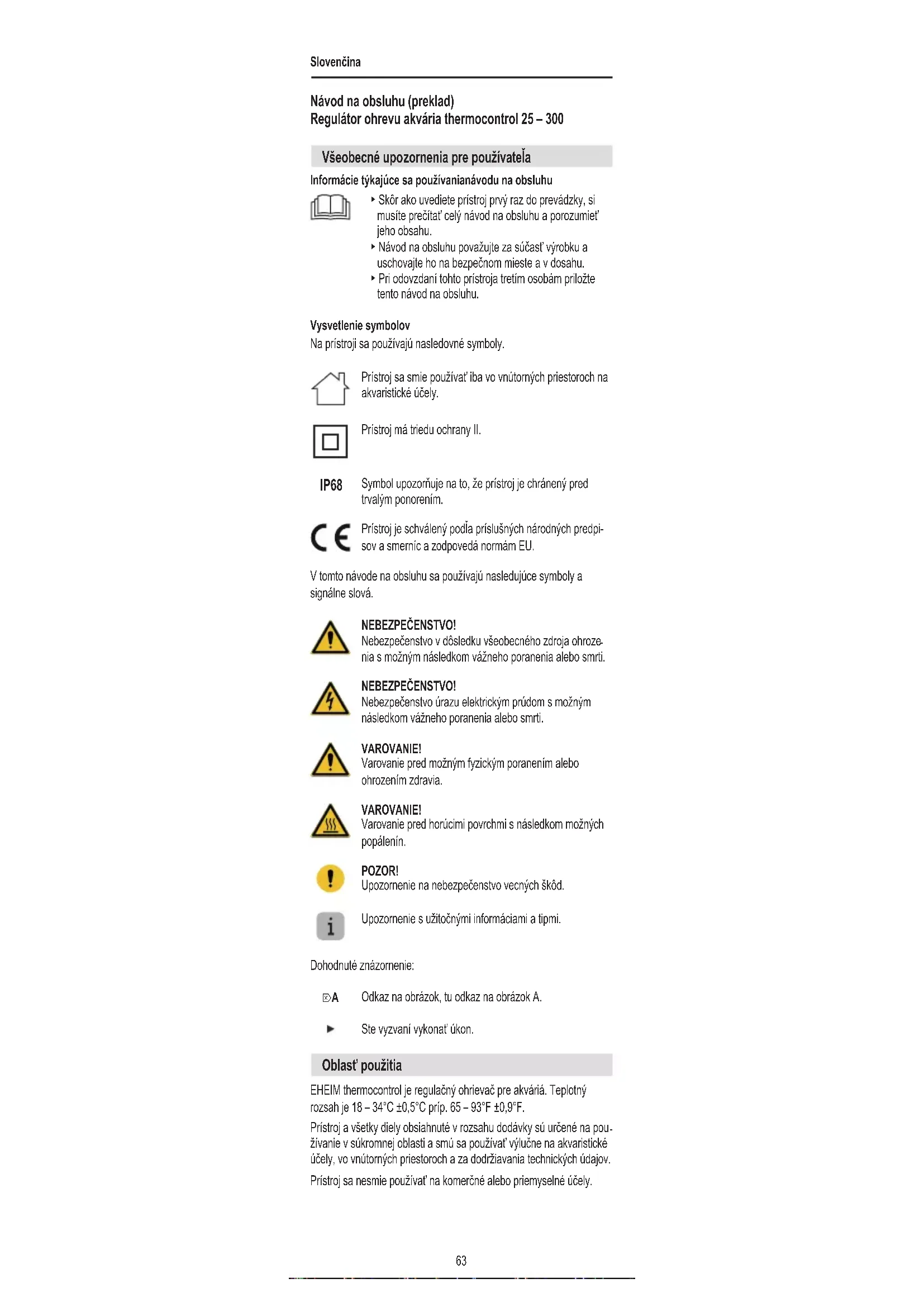 Návod na obsluhu (preklad) Regulátor ohrevu akvária thermocontrol 25 – 300 Všeobecné upozornenia pre používateľa Informácie týkajúce sa používanianávodu na obsluhu ▶ Skôr ako uvediete prístroj prvý raz do prevádzky, si musíte prečítať celý návod na obsluhu a porozumieť jeho obsahu. ▶ Návod na obsluhu považujte za súčasť výrobku a uschovajte ho na bezpečnom mieste a v dosahu. ▶ Pri odovzdaní tohto prístroja tretím osobám priložte tento návod na obsluhu. Vysvetlenie symbolov Na prístroji sa používajú nasledovné symboly. Prístroj sa smie používať iba vo vnútorných priestoroch na akvaristické účely. Prístroj má triedu ochrany II. IP68 Symbol upozorňuje na to, že prístroj je chránený pred trvalým ponorením. Prístroj je schválený podľa príslušných národných predpi- sov a smerníc a zodpovedá normám EU. V tomto návode na obsluhu sa používajú nasledujúce symboly a signálne slová. NEBEZPEČENSTVO! Nebezpečenstvo v dôsledku všeobecného zdroja ohroze