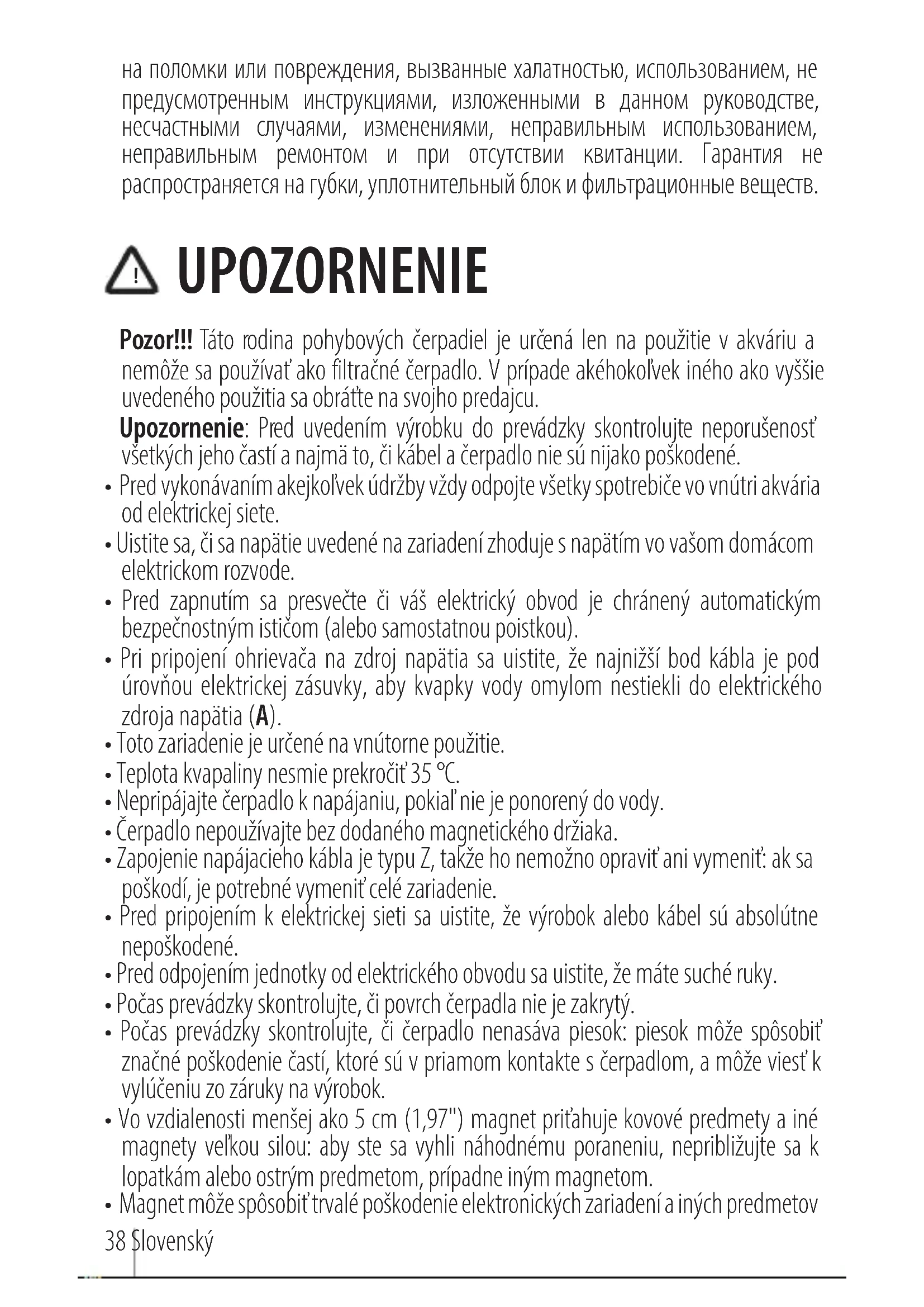 UPOZORNENIE Pozor!!! Táto rodina pohybových čerpadiel je určená len na použitie v akváriu a nemôže sa používať ako filtračné čerpadlo. V prípade akéhokoľvek iného ako vyššie uvedeného použitia sa obráťte na svojho predajcu. Upozornenie: Pred uvedením výrobku do prevádzky skontrolujte neporušenosť všetkých jeho častí a najmä to, či kábel a čerpadlo nie sú nijako poškodené.
