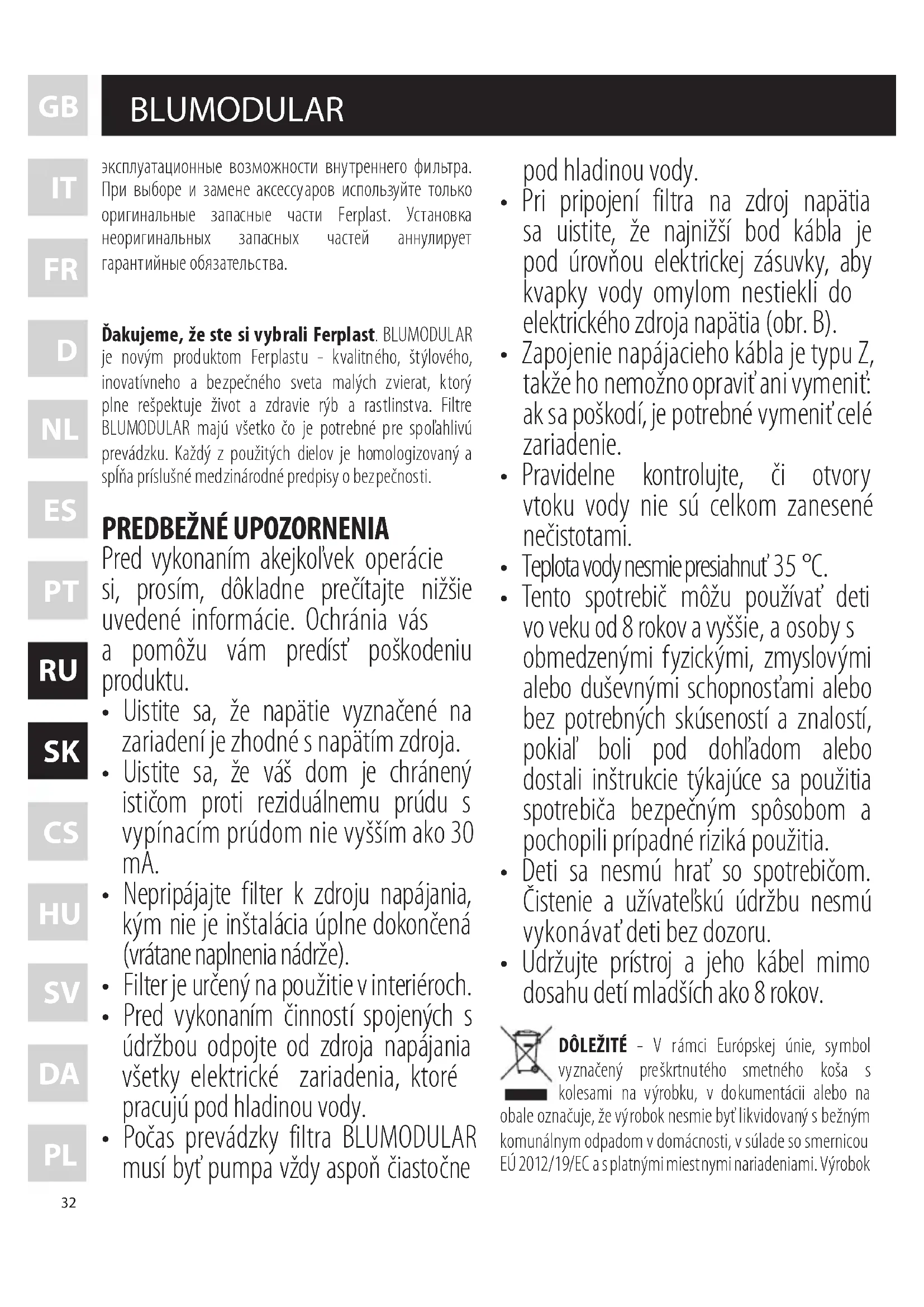эксплуатационные возможности внутреннего фильтра. При выборе и замене аксессуаров используй те только оригинальные запасные части Ferplast. Установка неоригинальных запасных частей аннулирует гарантийные обязате льства. Ďakujeme, že ste si vybrali Ferplast. BLUMODULAR je novým produktom Ferplastu - kvalitného, štýlového, inovatívneho a bezpečného sveta malých zvierat, ktorý plne rešpektuje život a zdravie rýb a rastlinstva. Filtre BLUMODULAR majú všetko čo je potrebné pre spoľahlivú prevádzku. Každý z použitých dielov je homologizovaný a spĺňa príslušné medzinárodné predpisy o bezpečnosti.