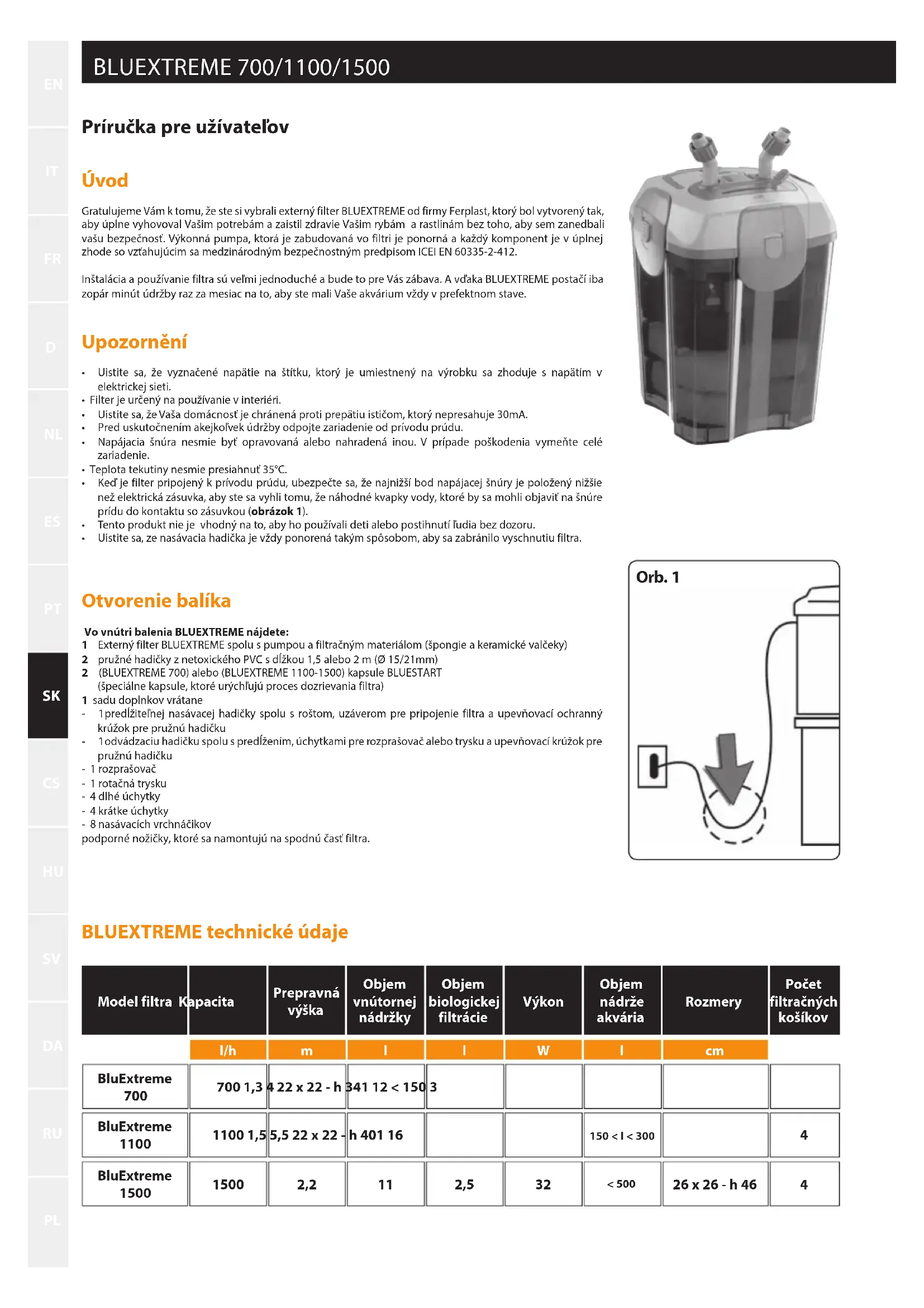 Príručka pre užívateľov Úvod Gratulujeme Vám k tomu, že ste si vybrali externý filter BLUEXTREME od firmy Ferplast, ktorý bol vytvorený tak, aby úplne vyhovoval Vašim potrebám a zaistil zdravie Vašim rybám a rastlinám bez toho, aby sem zanedbali vašu bezpečnosť. Výkonná pumpa, ktorá je zabudovaná vo filtri je ponorná a každý komponent je v úplnej zhode so vzťahujúcim sa medzinárodným bezpečnostným predpisom ICEI EN 60335-2-412.Inštalácia a používanie filtra sú veľmi jednoduché a bude to pre Vás zábava. A vďaka BLUEXTREME postačí iba zopár minút údržby raz za mesiac na to, aby ste mali Vaše akvárium vždy v prefektnom stave. Upozornění