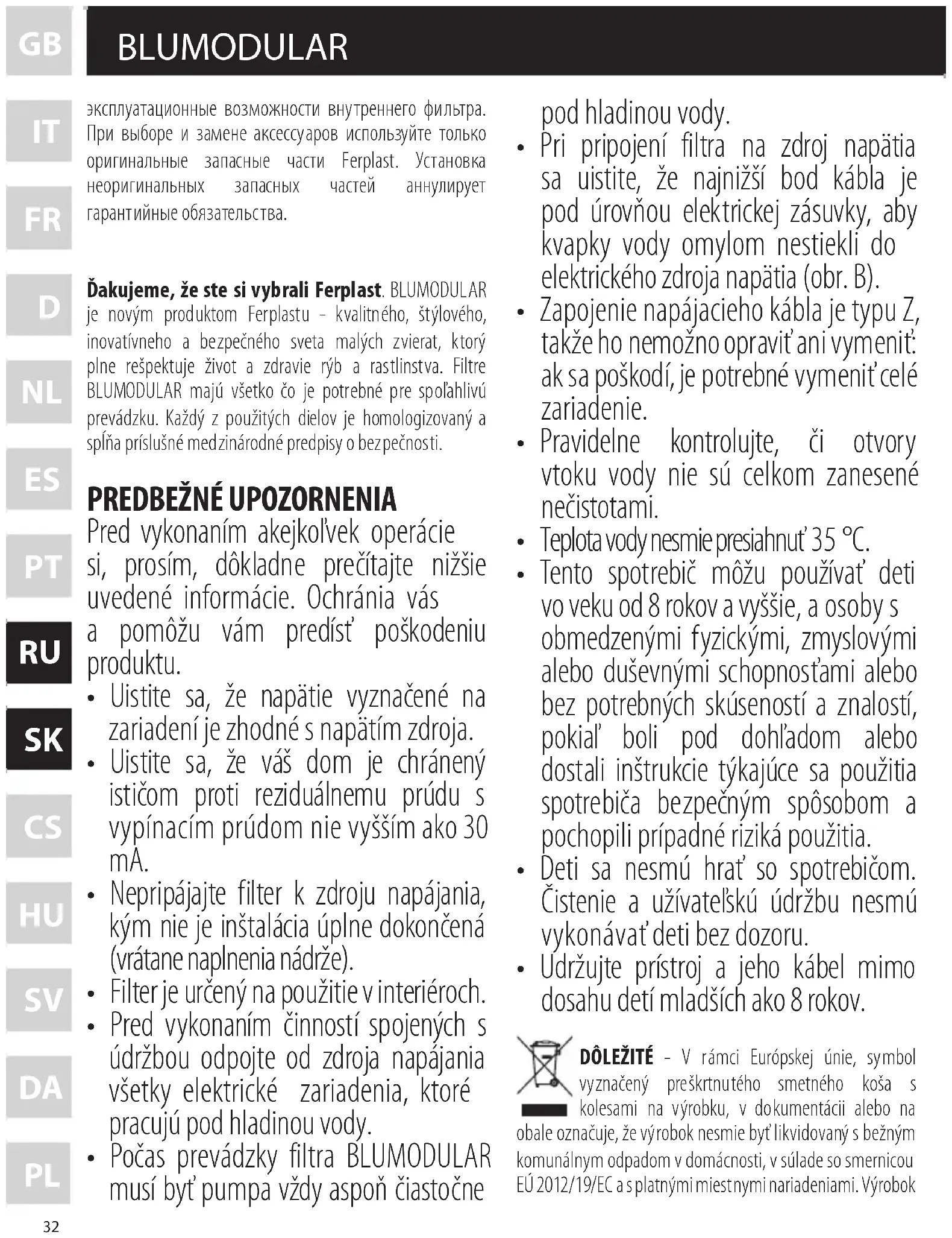 - Pri výmene komponentov filtra použite len originálne náhradné diely od spoločnosti Ferplast. Použitie neoriginálnych dielov má za následok zrušenie záruky. Náhradné diely a prísluš enstvo Všetky diely filtra sú ľahko vymeniteľné. Náhradné diely sú dostupné v predajniach, kde boli filtre zakúpené. V takýchto predajniach je dostupné aj rôznorodé príslušenstvo, ktoré je spoloč nosťou Ferplast neustále aktualizované a pomocou ktorého možno filter prispôsobiť akýmkoľvek potrebám. Na výmenu komponentu filtra môže byť použitý len originálny náhradný diel od spoločnosti Ferplast. Len tieto diely zaručujú prevádzkyschopnosť a bezpečnosť filtra. Inštalácia neoriginálnych dielov má za následok zrušenie záruky. Děkujeme vám, že jste si vybrali značku Ferplast. Filtr BLUMODULAR je novým produktem značky Ferplast - kvalitního, stylového, moderního a bezpečného světa malých zvířat, který plně respektuje život a zdraví ryb a rostlin. Filtry BLUMODULAR mají vše, co je potřebné ke spolehlivému provozu. Každý z použitých dílů je homologovaný a splňuje příslušné mezinárodní předpisy o bezpečnosti.