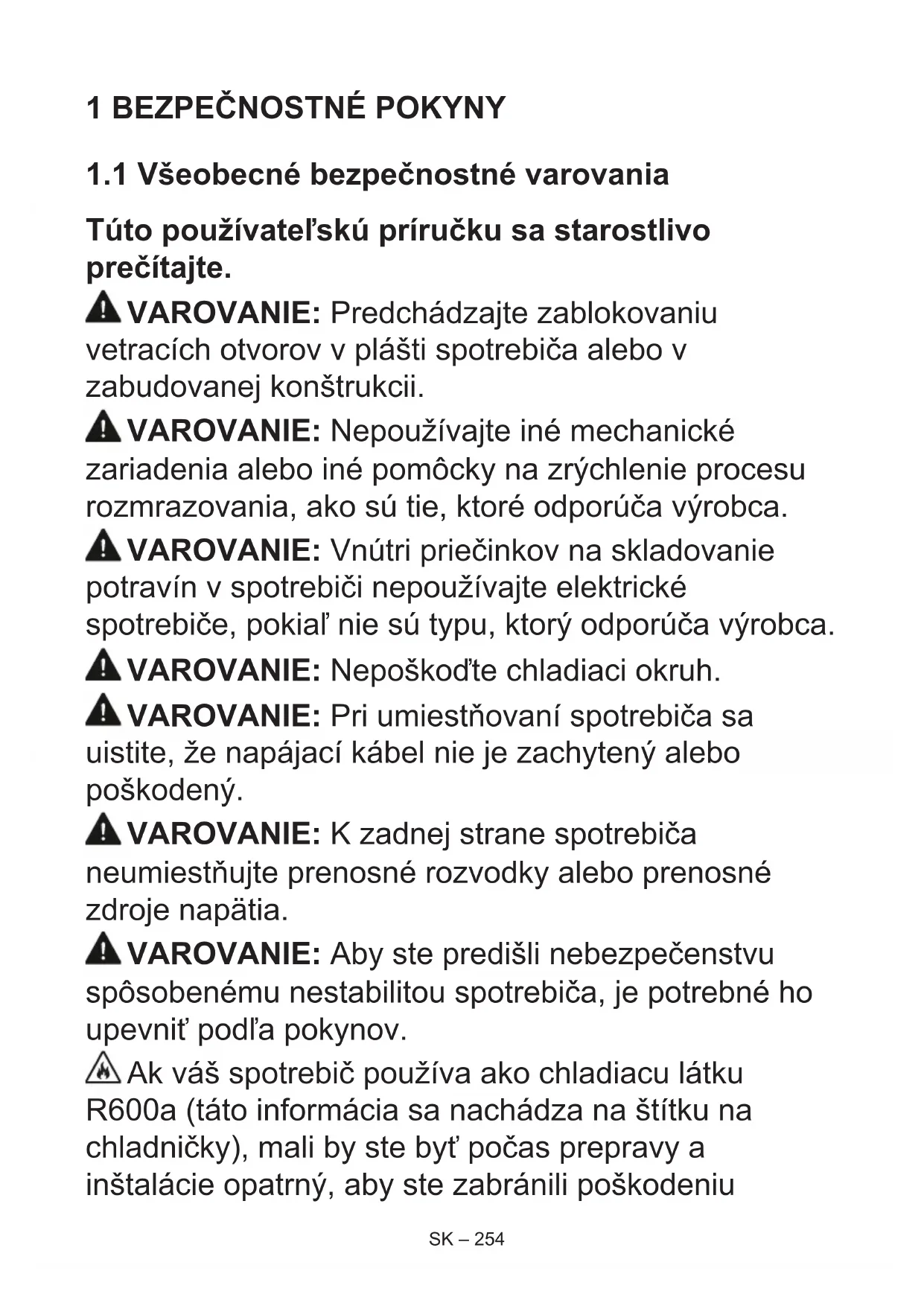 Túto používateľskú príručku sa starostlivo prečítajte. VAROVANIE: Predchádzajte zablokovaniu vetracích otvorov v plášti spotrebiča alebo v zabudovanej konštrukcii. VAROVANIE: Nepoužívajte iné mechanické zariadenia alebo iné pomôcky na zrýchlenie procesu rozmrazovania, ako sú tie, ktoré odporúča výrobca. VAROVANIE: Vnútri priečinkov na skladovanie potravín v spotrebiči nepoužívajte elektrické spotrebiče, pokiaľ nie sú typu, ktorý odporúča výrobca. VAROVANIE: Nepoškoďte chladiaci okruh. VAROVANIE: Pri umiestňovaní spotrebiča sa uistite, že napájací kábel nie je zachytený alebo poškodený. VAROVANIE: K zadnej strane spotrebiča neumiestňujte prenosné rozvodky alebo prenosné zdroje napätia. VAROVANIE: Aby ste predišli nebezpečenstvu spôsobenému nestabilitou spotrebiča, je potrebné ho upevniť podľa pokynov. Ak váš spotrebič používa ako chladiacu látku R600a (táto informácia sa nachádza na štítku na chladničky), mali by ste byť počas prepravy a inštalácie opatrný, aby ste zabránili poškodeniuSK – 255 chladiacich prvkov. R600a je prírodný plyn šetrný k životnému prostrediu, je však výbušný. V prípade úniku z dôvodu poškodenia chladiča presuňte chladničku mimo otvoreného ohňa alebo zdrojov tepla a vyvetrajte miestnosť, v ktorej sa spotrebič nachádza.