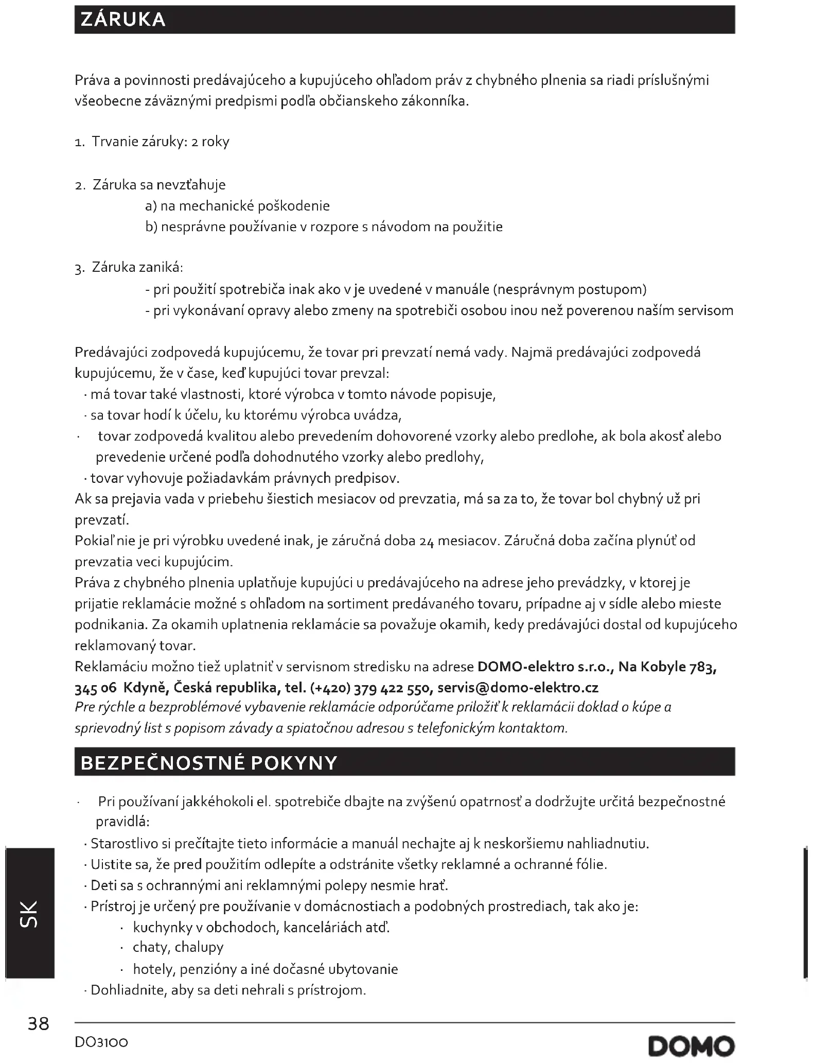 - tovar vyhovuje požiadavkám právnych predpisov. Ak sa prejavia vada v priebehu šiestich mesiacov od prevzatia, má sa za to, že tovar bol chybný už pri prevzatí. Pokiaľ nie je pri výrobku uvedené inak, je záručná doba 24 mesiacov. Záručná doba začína plynúť od prevzatia veci kupujúcim. Práva z chybného plnenia uplatňuje kupujúci u predávajúceho na adrese jeho prevádzky, v ktorej je prijatie reklamácie možné s ohľadom na sortiment predávaného tovaru, prípadne aj v sídle alebo mieste podnikania. Za okamih uplatnenia reklamácie sa považuje okamih, kedy predávajúci dostal od kupujúceho reklamovaný tovar. Reklamáciu možno tiež uplatniť v servisnom stredisku na adrese DOMO-elektro s.r.o., Na Kobyle 783, 345 06 Kdyně, Česká republika, tel. (+420) 379 422 550, servis@domo-elektro.cz Pre rýchle a bezproblémové vybavenie reklamácie odporúčame priložiť k reklamácii doklad o kúpe a sprievodný list s popisom závady a spiatočnou adresou s telefonickým kontaktom.