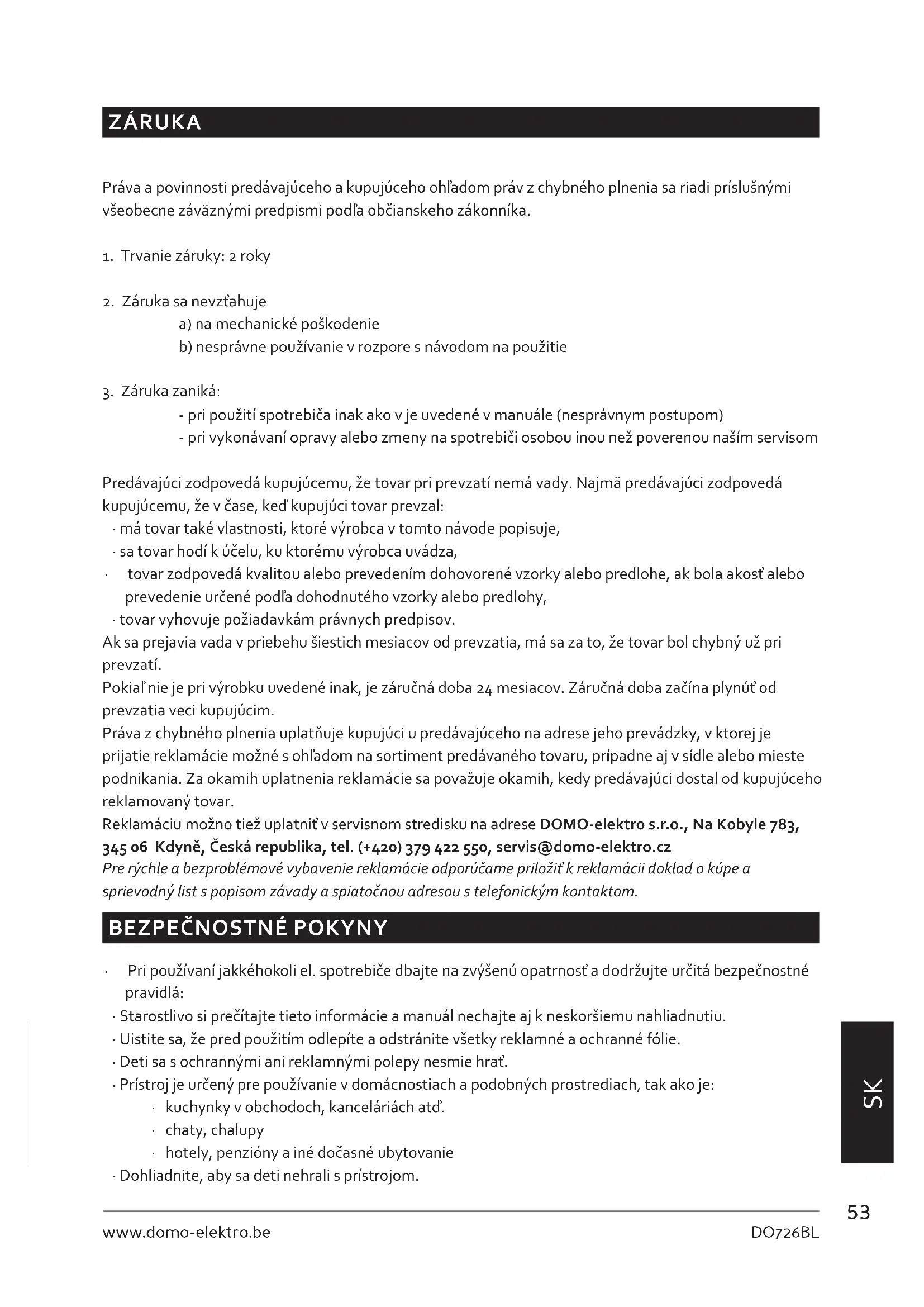 - tovar vyhovuje požiadavkám právnych predpisov. Ak sa prejavia vada v priebehu šiestich mesiacov od prevzatia, má sa za to, že tovar bol chybný už pri prevzatí. Pokiaľ nie je pri výrobku uvedené inak, je záručná doba 24 mesiacov. Záručná doba začína plynúť od prevzatia veci kupujúcim. Práva z chybného plnenia uplatňuje kupujúci u predávajúceho na adrese jeho prevádzky, v ktorej je prijatie reklamácie možné s ohľadom na sortiment predávaného tovaru, prípadne aj v sídle alebo mieste podnikania. Za okamih uplatnenia reklamácie sa považuje okamih, kedy predávajúci dostal od kupujúceho reklamovaný tovar. Reklamáciu možno tiež uplatniť v servisnom stredisku na adrese DOMO-elektro s.r.o., Na Kobyle 783, 345 06 Kdyně, Česká republika, tel. (+420) 379 422 550, servis@domo-elektro.cz Pre rýchle a bezproblémové vybavenie reklamácie odporúčame priložiť k reklamácii doklad o kúpe a sprievodný list s popisom závady a spiatočnou adresou s telefonickým kontaktom.