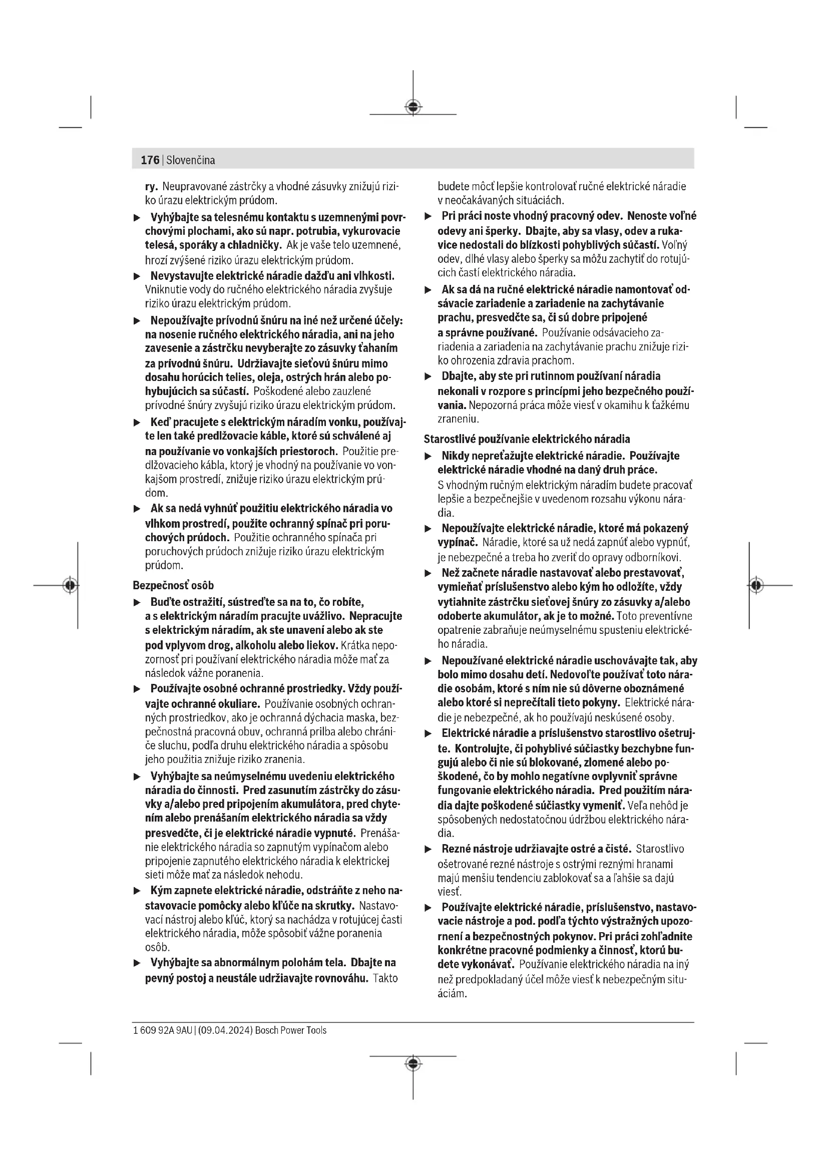 Provedení vypínače saretací Pro zapnutí elektrického nářadí stiskněte nejprve vypínač(3) ➊, poté ho posuňte dopředu ➋. Poté ho stiskněte adržte ho stisknutý ➌. Pro zaaretování stisknutého vypínače(3) posuňte vypínač(3)dál dopředu ➍. Pro vypnutí elektrického nářadí uvolněte vypínač(3), resp. pokud je zaaretovaný, krátce vypínač(3)stiskněte apoté ho uvolněte. 1 609 92A 9AU | (09.04.2024) Bosch Power ToolsSlovenčina | 175 Provedení vypínače bez aretace Pro zapnutí elektrického nářadí stiskněte nejprve vypínač(3) ➊, poté ho posuňte dopředu ➋. Poté ho stiskněte adržte ho stisknutý ➌. Pro vypnutí elektrického nářadí uvolněte spínač(3). u Brusné nástroje před použitím zkontrolujte. Brusný nástroj musí být bezvadně namontovaný amusí se volně otáčet. Proveďte zkušební chod po dobu minimálně 1minuty bez zatížení. Nepoužívejte poškozené, neokrouhlé nebo vibrující brusné nástroje. Poškozené brusné nástroje mohou prasknout azpůsobit poranění. Údržba aservis Údržba ačištění u Před každou prací na elektronářadí vytáhněte zástrčku ze zásuvky. u Udržujte elektronářadí avětrací otvory čisté, aby pracovalo dobře abezpečně. u Při použití vextrémních podmínkách používejte pokud možno vždy odsávací zařízení. Často vyfukujte větrací otvory apřed nářadí zapojte proudový chránič. Při řezání kovů se může uvnitř elektronářadí usazovat vodivý prach. To může negativně ovlivnit ochrannou izolaci elektronářadí. Příslušenství pečlivě ukládejte azacházejte sním opatrně. Je-li nutná výměna přívodního kabelu, nechte ji provést firmou Bosch nebo autorizovaným servisem pro elektronářadí Bosch, abyste zabránili ohrožení bezpečnosti. Zákaznická služba aporadenství ohledně použití Zákaznická služba zodpoví vaše dotazy kopravě aúdržbě vašeho výrobku atéž knáhradním dílům. Rozkladové výkresy ainformace onáhradních dílech najdete také na: www.bosch-pt.com Vpřípadě dotazů knašim výrobkům apříslušenství vám ochotně pomůže poradenský tým Bosch. Vpřípadě veškerých otázek aobjednávek náhradních dílů bezpodmínečně uveďte 10místné věcné číslo podle typového štítku výrobku. Czech Republic Robert Bosch odbytová s.r.o. Bosch Service Center PT K Vápence 1621/16 692 01 Mikulov Na www.bosch-pt.cz si si můžete objednat opravu Vašeho stroje nebo náhradní díly online. Tel.: +420 519 305700 Fax: +420 519 305705 E-Mail: servis.naradi@cz.bosch.com www.bosch-pt.cz Další adresy servisů najdete na: www.bosch-pt.com/serviceaddresses Likvidace Elektronářadí, příslušenství aobaly odevzdejte kekologické recyklaci. Elektronářadí nevyhazujte do domovního odpadu! Pouze pro zeměEU: Již nepoužitelná elektrická nářadí se musí likvidovat ve tříděném odpadu. Použijte určená sběrná místa. Při nesprávné likvidaci mohou odpadní elektrická aelektronická zařízení kvůli případnému obsahu nebezpečných látek poškodit životní prostředí alidské zdraví. Slovenčina Bezpečnostné upozornenia Všeobecné bezpečnostné upozornenia pre elektrické náradie VÝSTRAHA Prečítajte si všetky bezpečnostné upozornenia, pokyny, ilustrácie ašpecifikácie dodané stýmto elektrickým náradím. Nedodržiavanie všetkých uvedených pokynov môže mať za následok úraz elektrickým prúdom, požiar a/alebo ťažké poranenie. Tieto výstražné upozornenia abezpečnostné pokyny starostlivo uschovajte na budúce použitie. Pojem „elektrické náradie“ používaný vnasledujúcom texte sa vzťahuje na elektrické náradie napájané zo siete (sprívod- nou šnúrou) ana elektrické náradie napájané akumulátoro- vou batériou (bez prívodnej šnúry). Bezpečnosť na pracovisku u Pracovisko vždy udržiavajte čisté adobre osvetlené. Neporiadok aneosvetlené priestory pracoviska môžu mať za následok pracovné úrazy. u Nepoužívajte elektrické náradie vo výbušnom pro- stredí, napr. tam, kde sa nachádzajú horľavé kvapali- ny, plyny alebo horľavý prach. Ručné elektrické náradie vytvára iskry, ktoré by mohli zapáliť prach alebo výpary. u Nedovoľte deťom ainým nepovolaným osobám, aby sa počas používania elektrického náradia zdržiavali vblízkosti pracoviska. Pri rozptyľovaní môžete stratiť kontrolu nad náradím. Bezpečnosť – elektrina u Zástrčka prívodnej šnúry elektrického náradia musí zodpovedať použitej zásuvke. Vžiadnom prípade nija- ko nemeňte zástrčku. Suzemneným elektrickým náradím nepoužívajte ani žiadne zástrčkové adapté- Bosch Power Tools 1 609 92A 9AU | (09.04.2024)176 | Slovenčina ry. Neupravované zástrčky avhodné zásuvky znižujú rizi- ko úrazu elektrickým prúdom. u Vyhýbajte sa telesnému kontaktu suzemnenými povr- chovými plochami, ako sú napr. potrubia, vykurovacie telesá, sporáky achladničky. Ak je vaše telo uzemnené, hrozí zvýšené riziko úrazu elektrickým prúdom. u Nevystavujte elektrické náradie dažďu ani vlhkosti. Vniknutie vody do ručného elektrického náradia zvyšuje riziko úrazu elektrickým prúdom. u Nepoužívajte prívodnú šnúru na iné než určené účely: na nosenie ručného elektrického náradia, ani na jeho zavesenie azástrčku nevyberajte zo zásuvky ťahaním za prívodnú šnúru. Udržiavajte sieťovú šnúru mimo dosahu horúcich telies, oleja, ostrých hrán alebo po- hybujúcich sa súčastí. Poškodené alebo zauzlené prívodné šnúry zvyšujú riziko úrazu elektrickým prúdom. u Keď pracujete selektrickým náradím vonku, používaj- te len také predlžovacie káble, ktoré sú schválené aj na používanie vo vonkajších priestoroch. Použitie pre- dlžovacieho kábla, ktorý je vhodný na používanie vo von- kajšom prostredí, znižuje riziko úrazu el