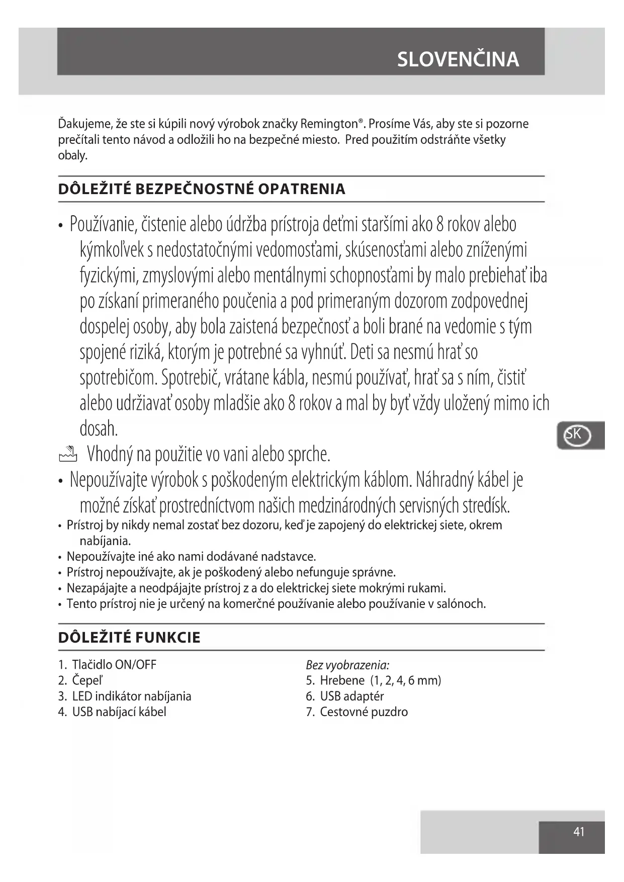 Aby sme sa vyhli environmentálnym a zdravotným problémom vyplývajúcim z nebezpečných látok, prístroje a nabíjateľné a nenabíjateľné batérie označené niektorým z týchto symbolov nesmú byť vyhadzované do netriedeného komunálneho odpadu. Vždy odovzdávajte elektrické a elektronické výrobky a tam, kde je to možné, aj nabíjateľné a nenabíjateľné batérie, na k tomu určených ociálnych recyklačných/zberných miestach. SLOVENČINA45 Děkujeme, že jste si zakoupili nový výrobek značky Remington®. Přečtěte si prosím pozorně návod a uložte ho na bezpečné místo. Před použitím odstraňte veškeré obaly. DŮLEŽITÁ BEZPEČNOSTNÍ OPATŘENÍ
