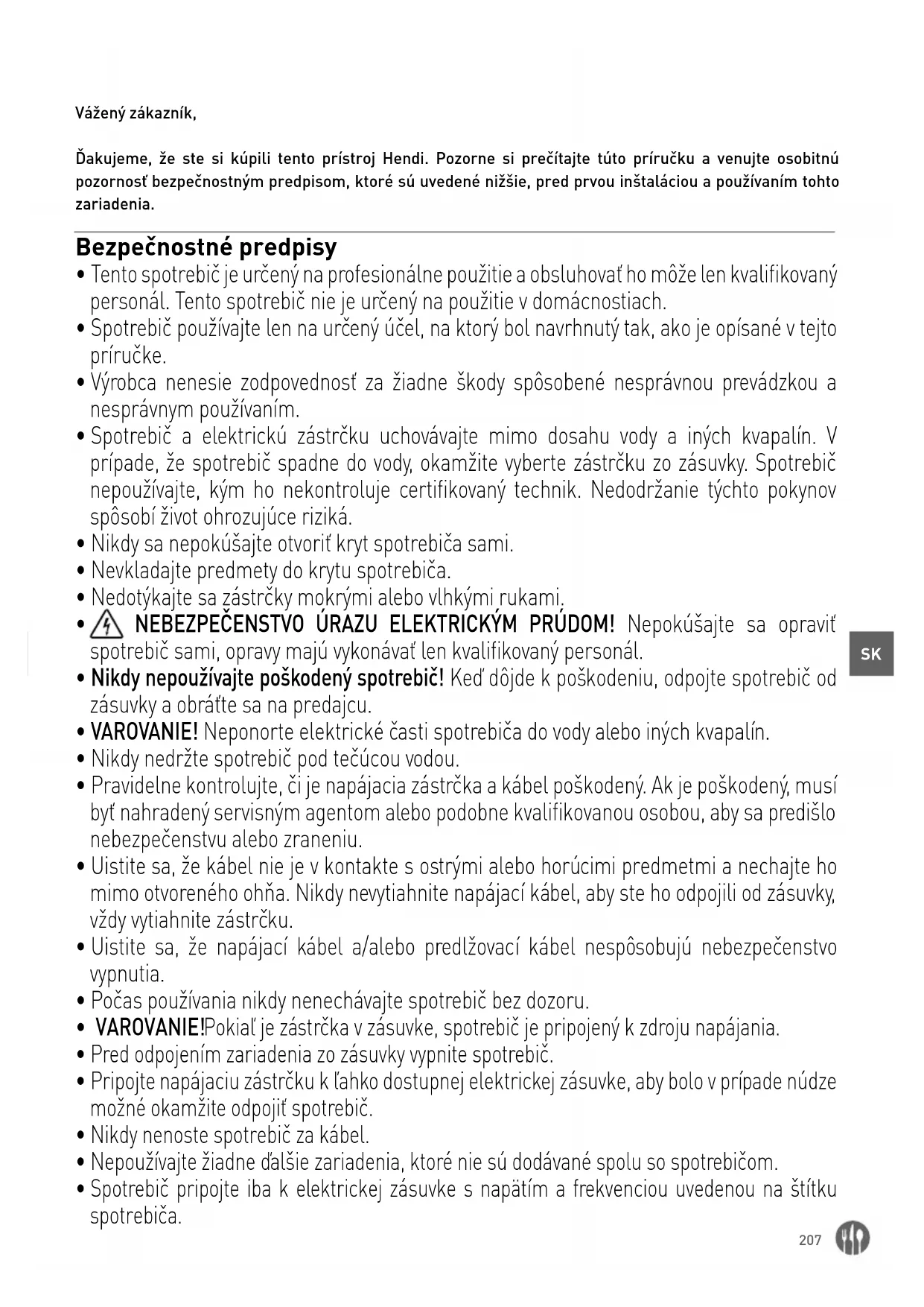 Vážený zákazník, Ďakujeme, že ste si kúpili tento prístroj Hendi. Pozorne si prečítajte túto príručku a venujte osobitnú pozornosť bezpečnostným predpisom, ktoré sú uvedené nižšie, pred prvou inštaláciou a používaním tohto zariadenia. Bezpečnostné predpisy