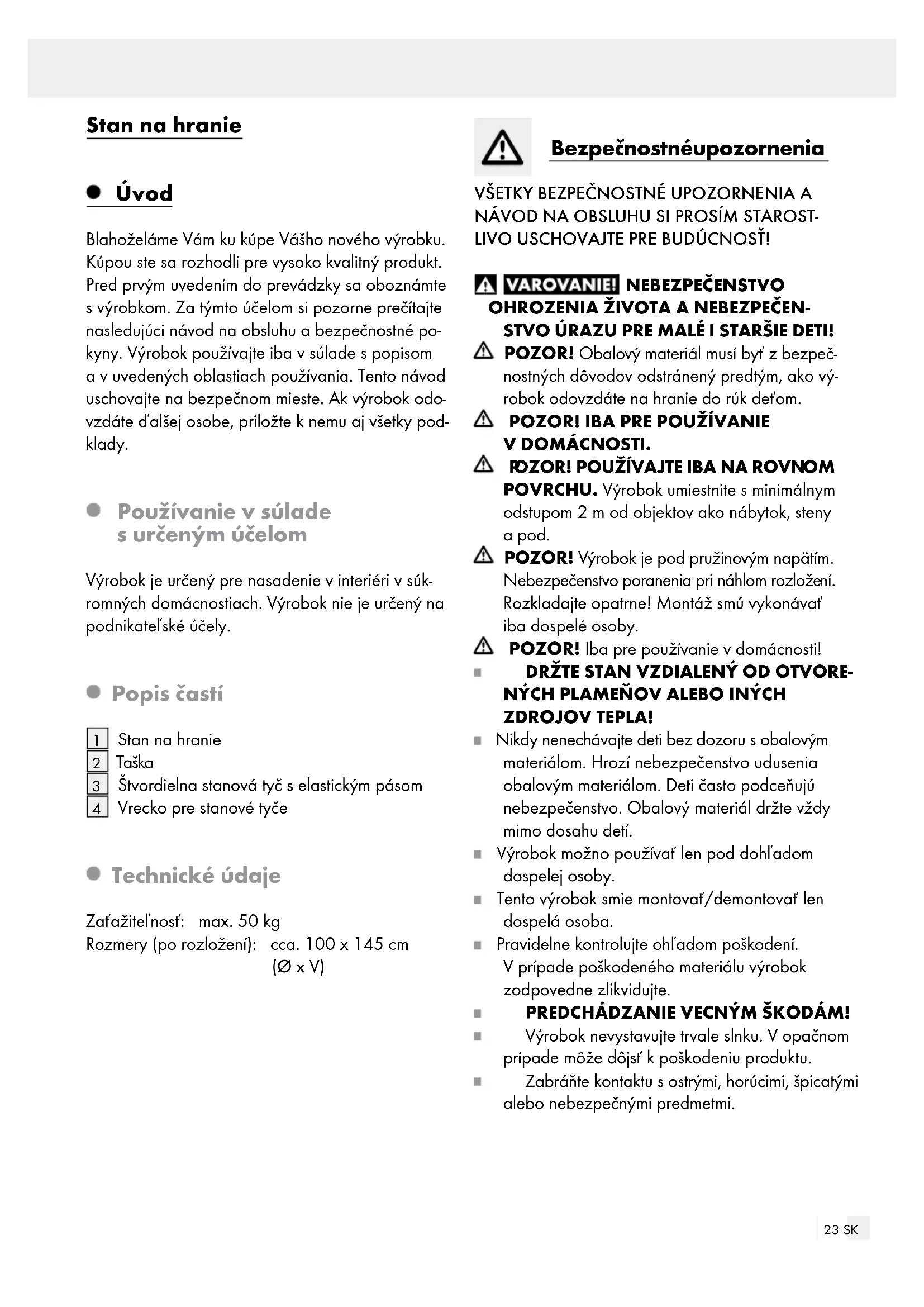 ebezpečenstvo poranenia pri náhlom rozlože ní. Rozkladajte opatrne! Montáž smú vykonávať iba dospelé osoby. POZOR! Iba pre používanie v domácnosti!