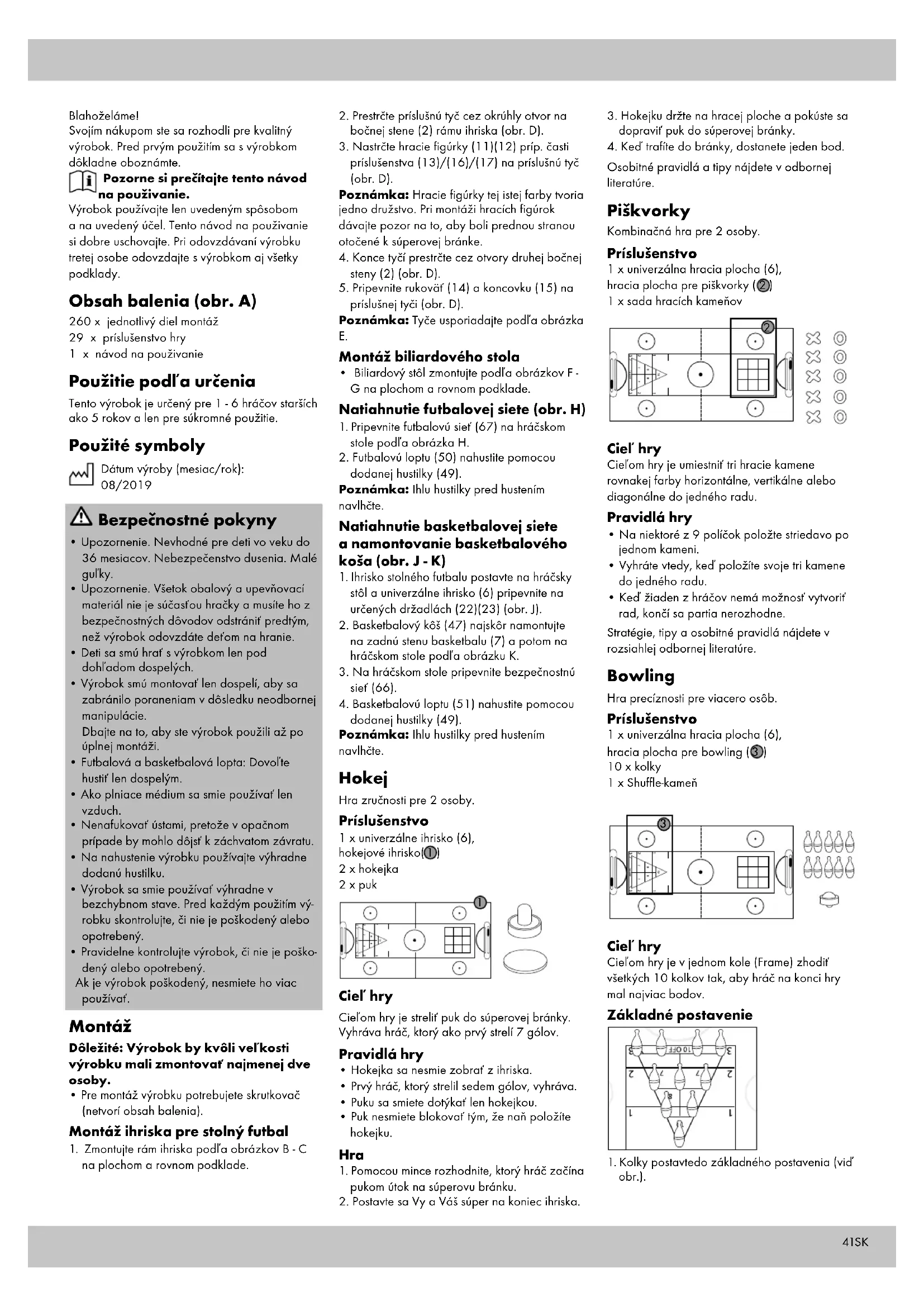 - Vyhral ten hráč, ktorý ako prvý vyhodil všetky svoje kamene kockou. Stratégie, tipy a osobitné pravidlá nájdete v rozsiahlej odbornej literatúre. Príslušenstvo a ďalšie hry 1 x sada kariet 1 x hra s hádzaním krúžkov 1 x hádzanie podkovou 2 x tyč na hádzanie s prísavkou Skladovanie, čistenie Pri nepoužívaní skladujte výrobok vždy suchý a čistý pri izbovej teplote. Čistite iba suchou handričkou. DÔLEŽITÉ! Výrobok nikdy nečistite ostrými čistiacimi prostriedkami. Pokyny k likvidácii Výrobok a obalový materiál zlikvidujte v súlade s aktuálnymi miestnymi predpismi. Obalový materiál, ako napr. fóliové vrecúško nepatrí do rúk detí. Obalový materiál uschovajte mimo dosahu detí. Výrobky a obaly likvidujte ekologickým spôsobom. Recyklačný kód slúži na označenia rôznych materiálov na navrátenie do obehu opätovného využitia. Kód sa skladá z recyklačného symbolu - ktorý má odzrkadľovať zhodnotenie recyklačnýého obehu - a číslo označujúce materiál. Pokyny k záruke a priebehu servisu Produkt bol vyrobený s maximálnou zodpovednosťou a v priebehu výroby bol neustále kontrolovaný. Na tento produkt máte tri roky záruku od dátumu kúpy produktu. Pokladničný lístok si odložte. Záruka sa vzťahuje len na chyby materiálu a výrobné chyby a zaniká pri neodbornej manipulácii s produktom. Záruka nemá vplyv na Vaše zákonné práva, predovšetkým na práva vyplývajúce zo záruky. V prípade reklamácie sa obráťte na nižšie uvedenú servisnú linku, alebo nám napíšte e-mail. Naši servisní zamestnanci sa s Vami dohodnú na ďalšom postupe a urýchlene vykonajú všetky potrebné kroky. V každom prípade Vám poradíme osobne. Záručná lehota sa nepredlžuje v dôsledku eventuálnych opráv na základe záruky, zákonného plnenia záruky alebo v dôsledku prejavu ochoty. To platí tiež pre vymenené alebo opravené diely. Opravy vykonané po uplynutí záručnej lehoty sú spoplatnené. IAN: 322143_1901 Servis Slovensko Tel.: 0850 232001 E-Mail: deltasport@lidl.sk464748